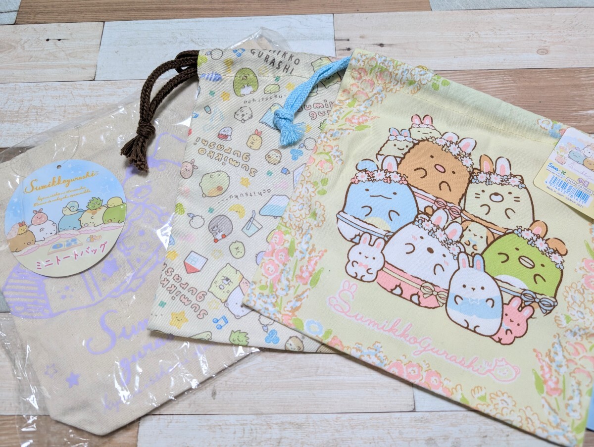 すみっコぐらしの巾着2枚とミニトートバッグです。