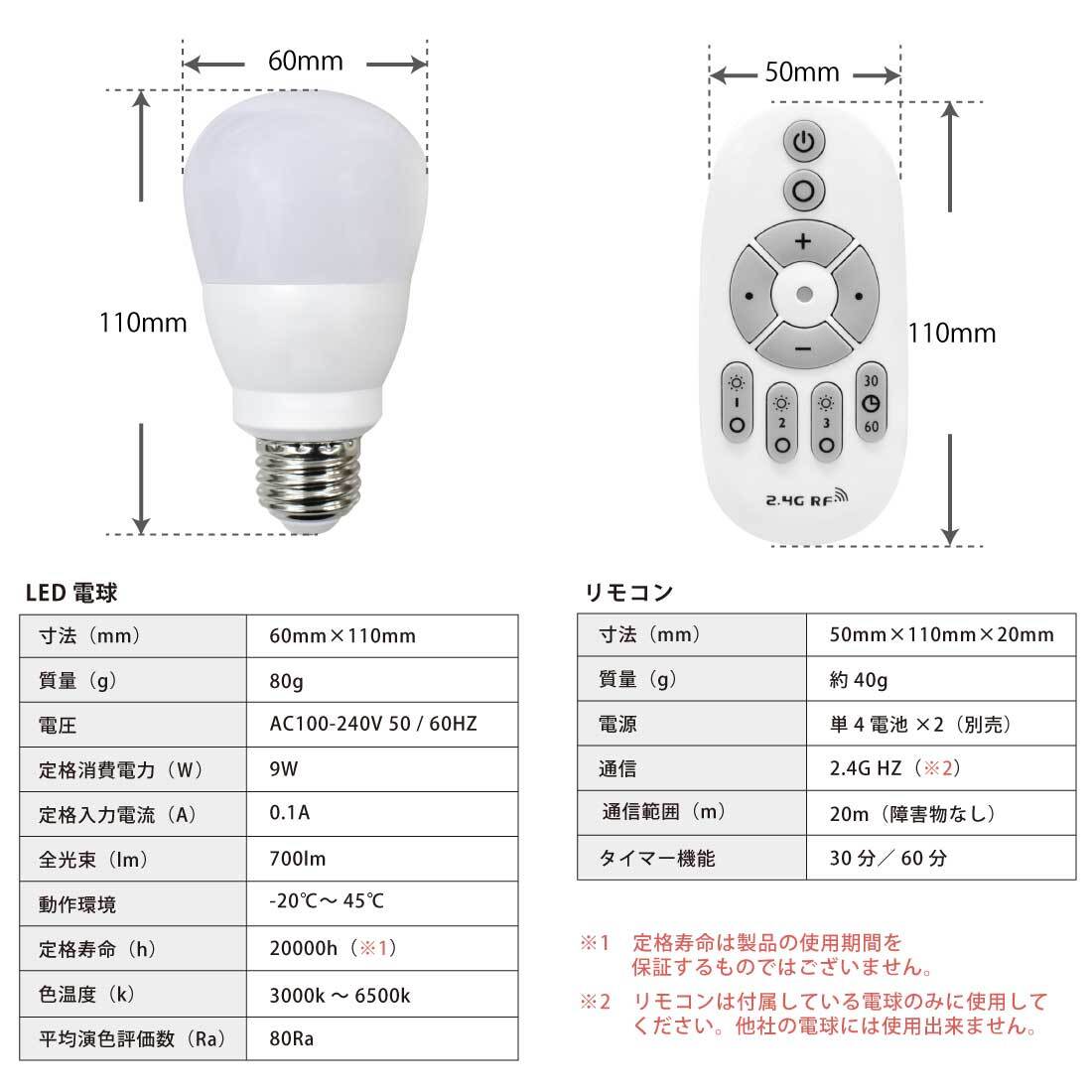 9WLED電球 4個セット 50W相当 E26口金 リモコン付き 700lm 3000/6500k 調色 調光 照明 電球色 昼白色 昼光色
