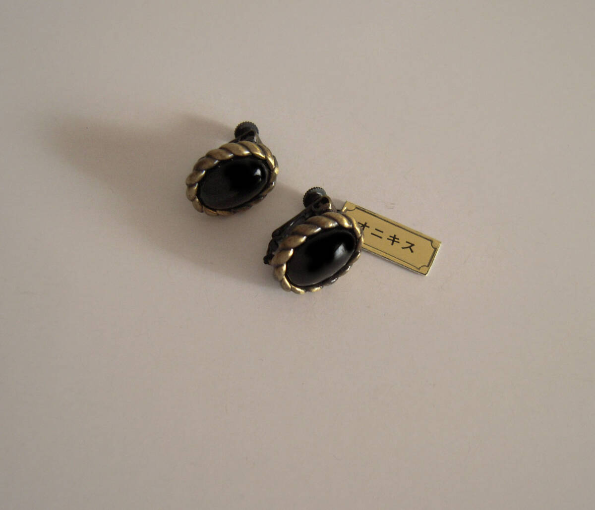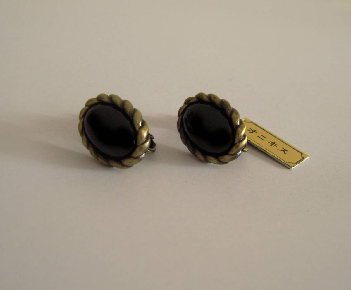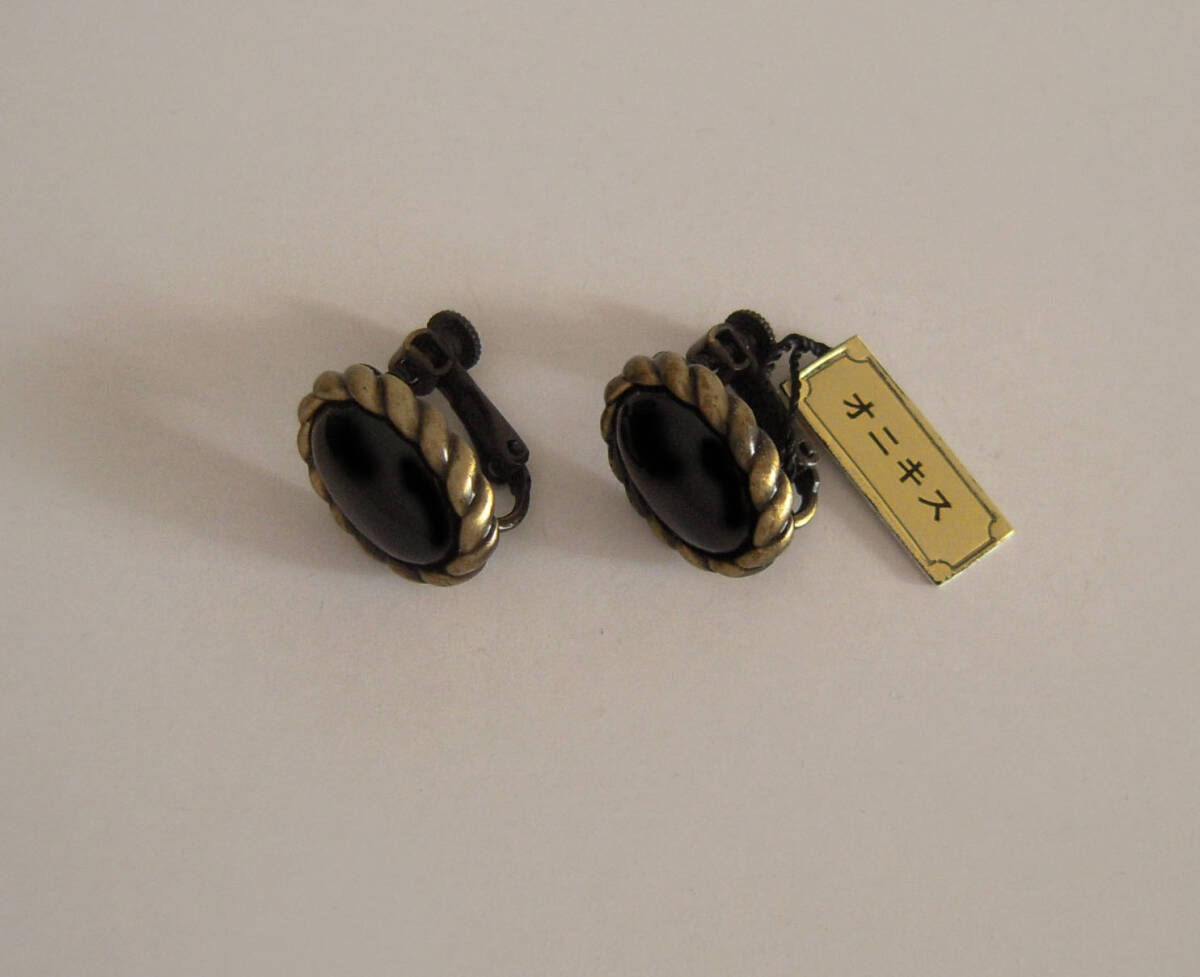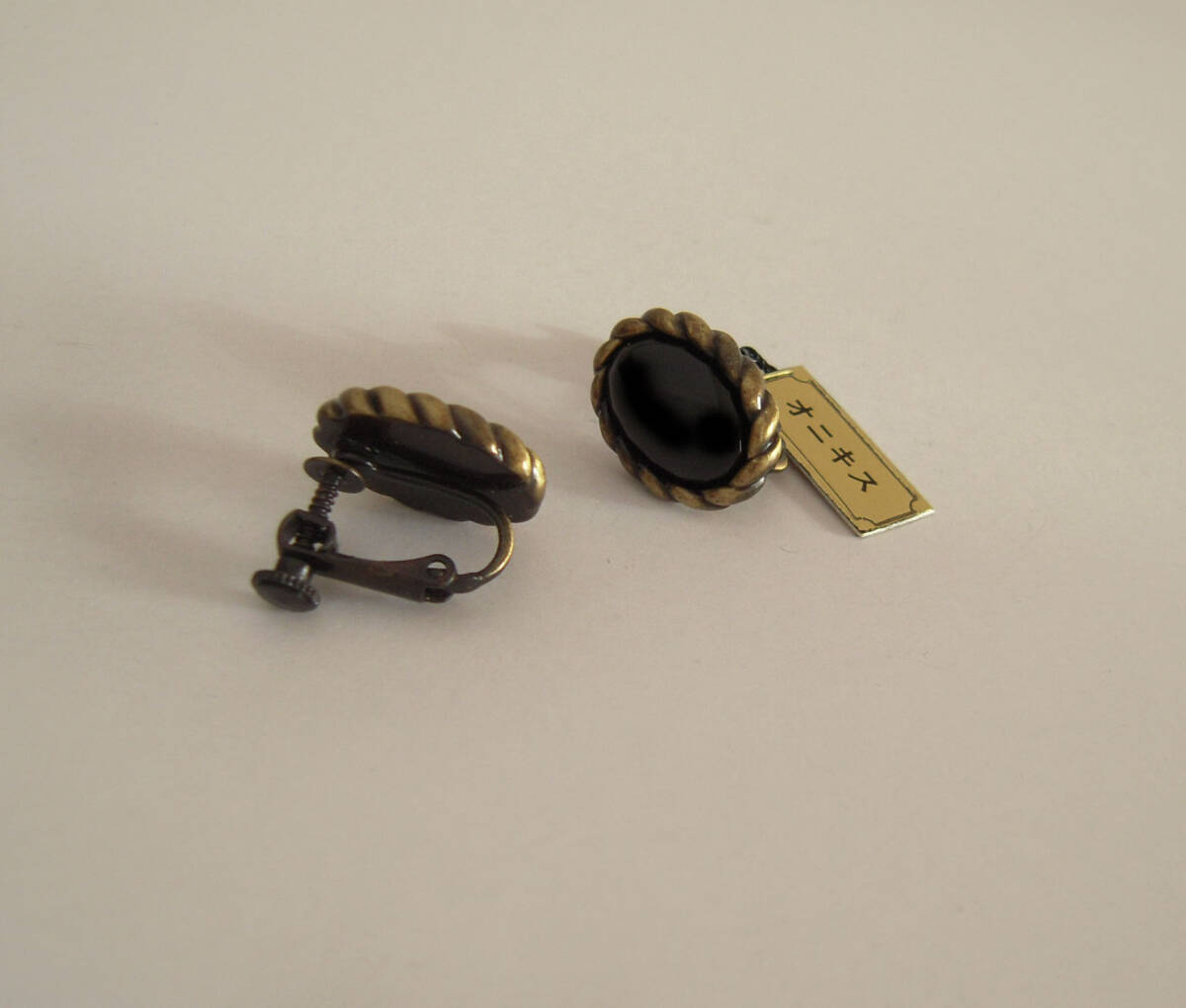 オニキス イヤリング オーバル 楕円 アンティークブロンズ ヴィンテージ 天然石 黒 レトロ ブラック