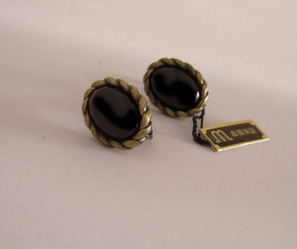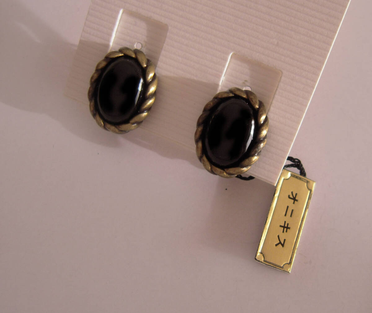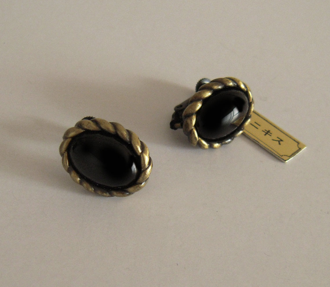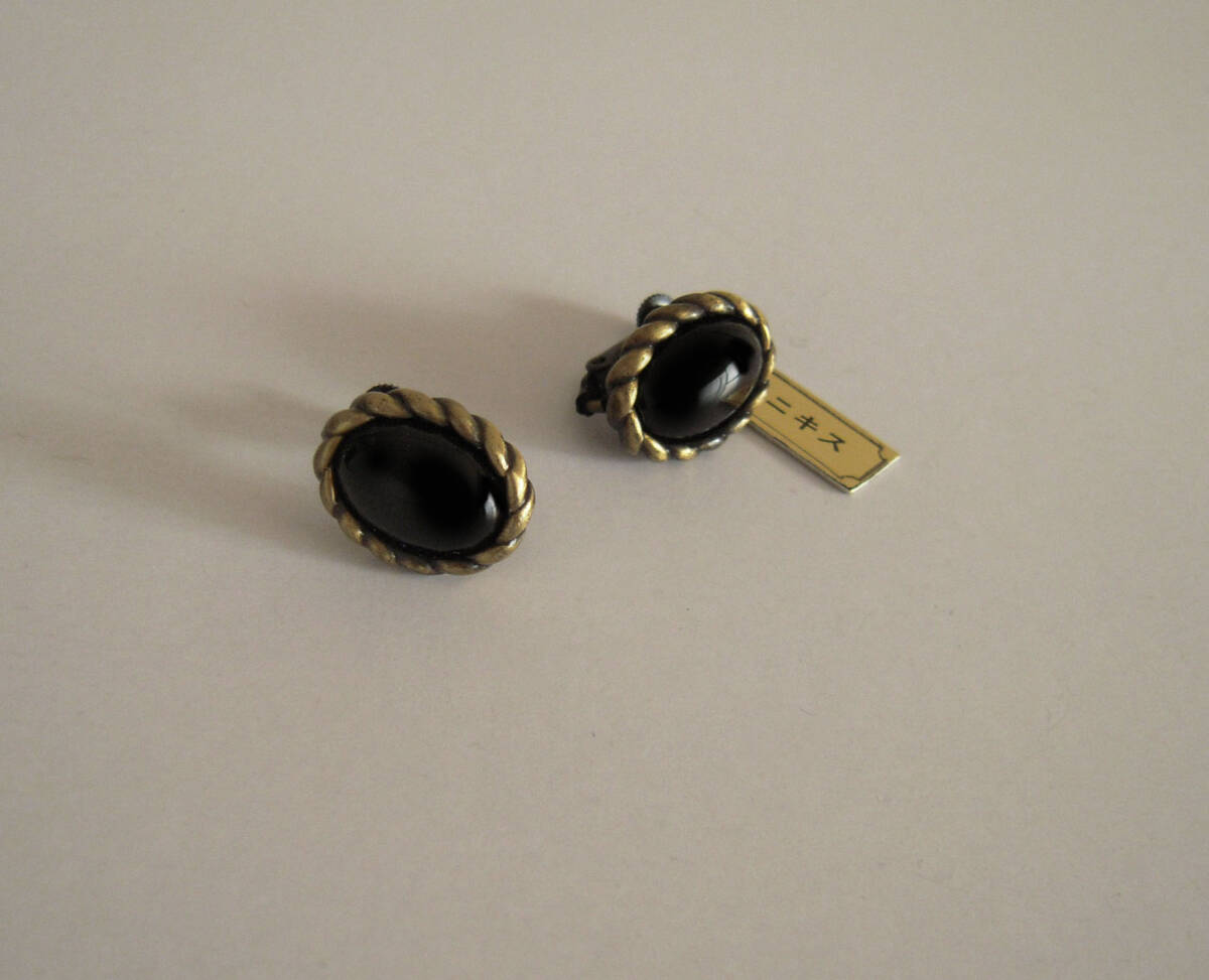 オニキス イヤリング オーバル 楕円 アンティークブロンズ ヴィンテージ 天然石 黒 レトロ ブラック