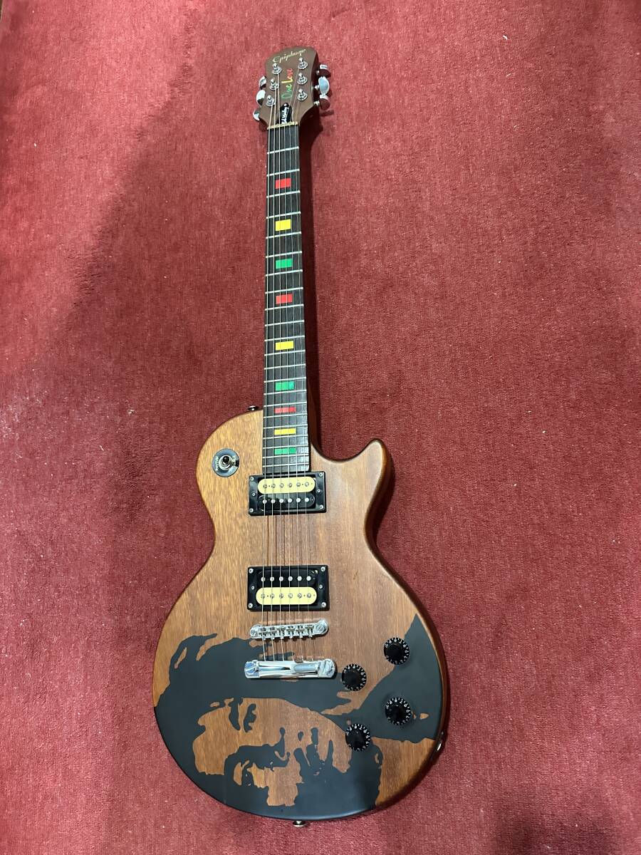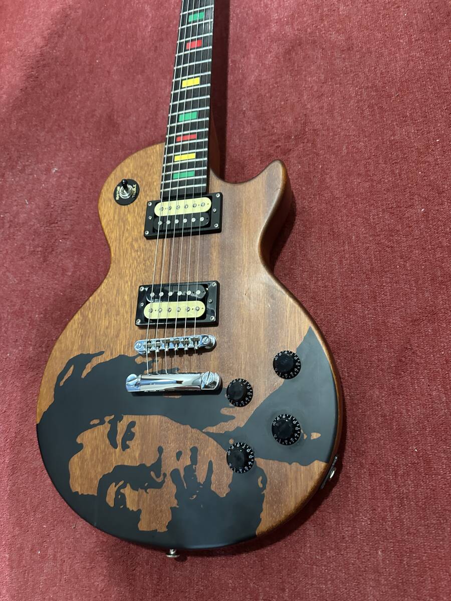 特別な指板インレイ、ヘッドストック、ボディ・アートが施された、希少なボブ・マーリー・レスポール・スペシャルになります。見た目だけのギターではなく、このギターは楽器としての演奏状態も良く、楽器店でメンテナンスし弦も新しく変えております。
