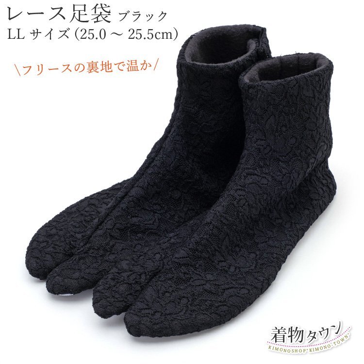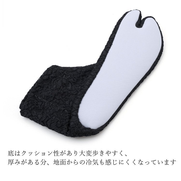 商品説明 | 裏生地に肌触りが良くとても曖かいフリース生地を使用し、 底生地にはクッション底を採用した、寒い日にも快適にご愛用いただける、おしゃれなレース足袋です |