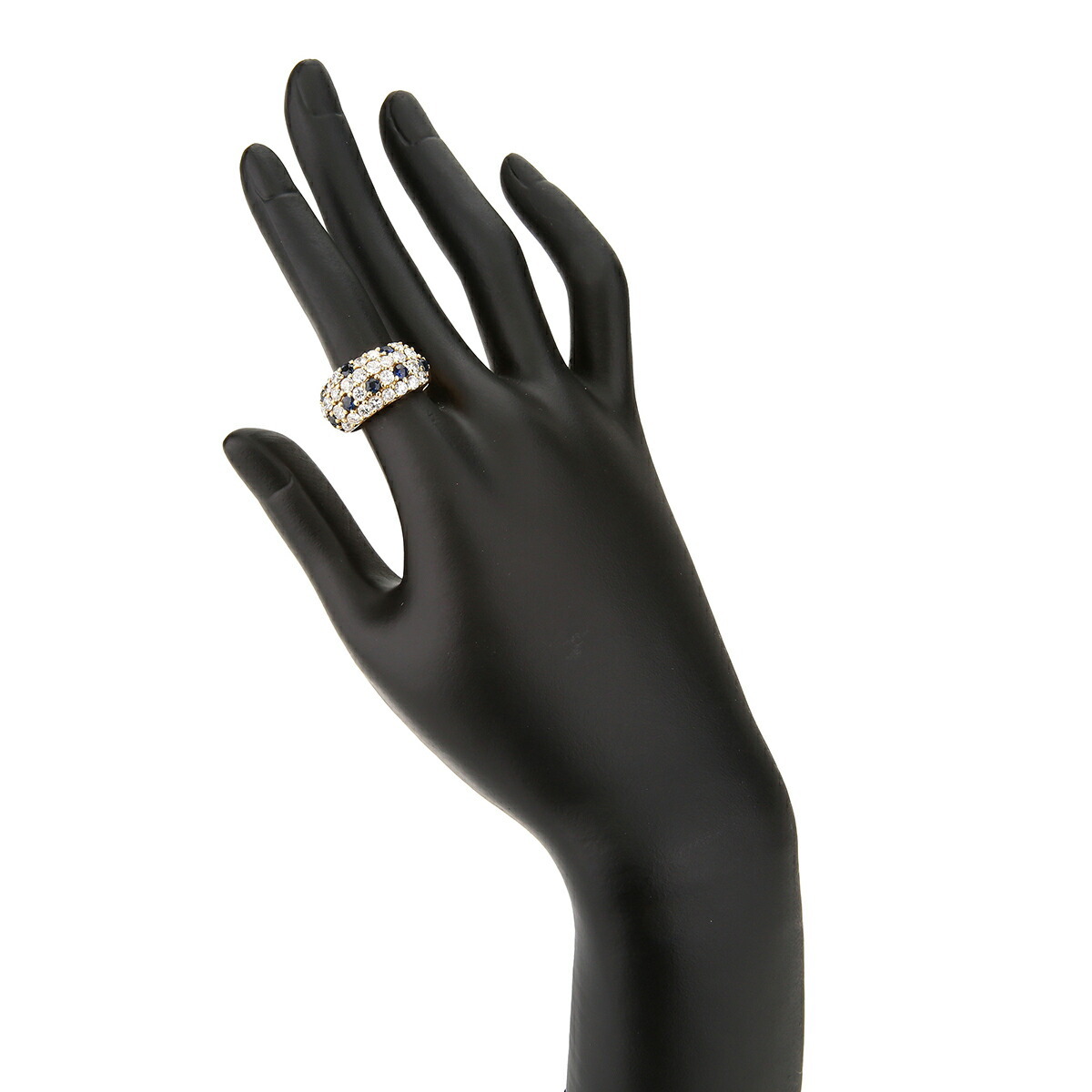 光り輝くメレダイヤモンドの中に散りばめられたサファイアが特徴的なデザインのリング。一目見るだけで視線が吸い込まれるような感覚に陥るインパクトのあるデザインは、ファッションにアクセントが欲しい方におすすめのリングです。