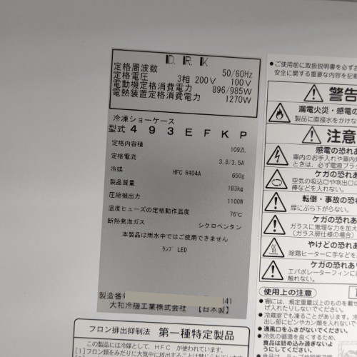 リーチインショーケース スイング扉 大和冷機 493EFKP 業務用 中古/送料別途見積