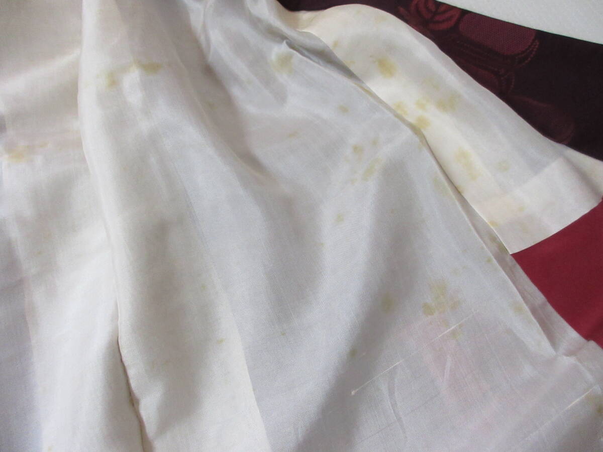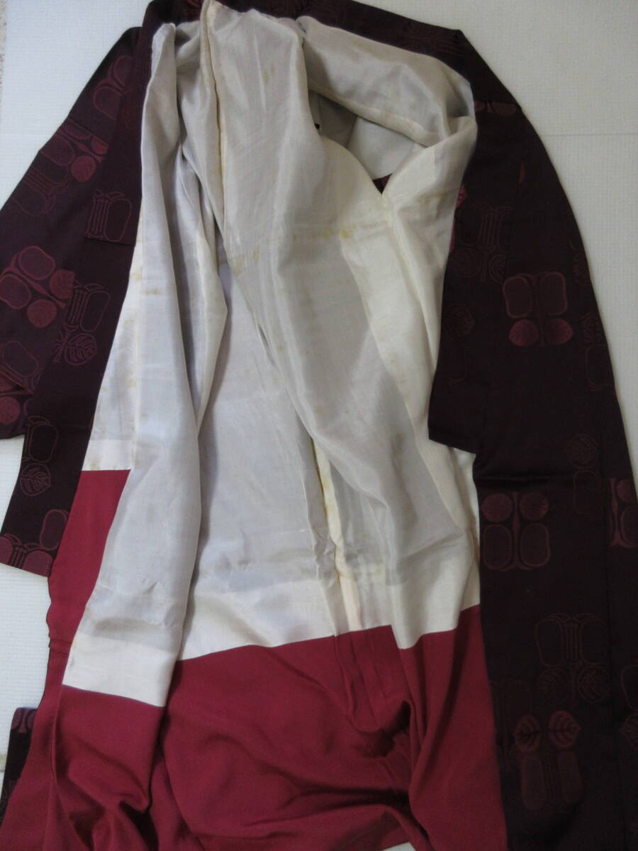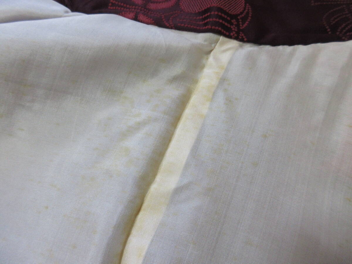 オークションをご覧いただきありがとうございます。 ★サイズ★ 身丈 約140.5㎝ 裄丈 約62㎝ 袖丈 約45.5㎝ 前巾 約26.5㎝ ※平置き実寸です。素人採寸の為、多少の誤差はご了承ください。 ★状態★中古品 内側全体的にシミがございます。 詳細不明、画像判断でよろしくお願いします。 段ボール保管になりますので折りジワがございます。 状態は正確に記載するよう心がけておりますが、記載している以外の見落としについてはご容赦ください。 状態などは個人の主観ですので、神経質な方のご入札はご遠慮いただけますようよろしくお願いします。 | |||