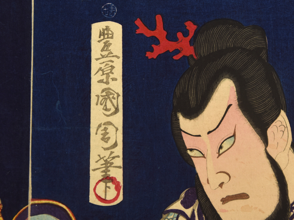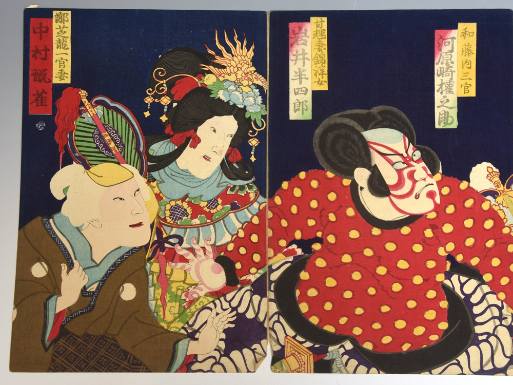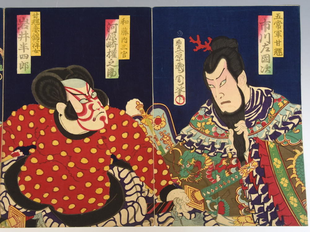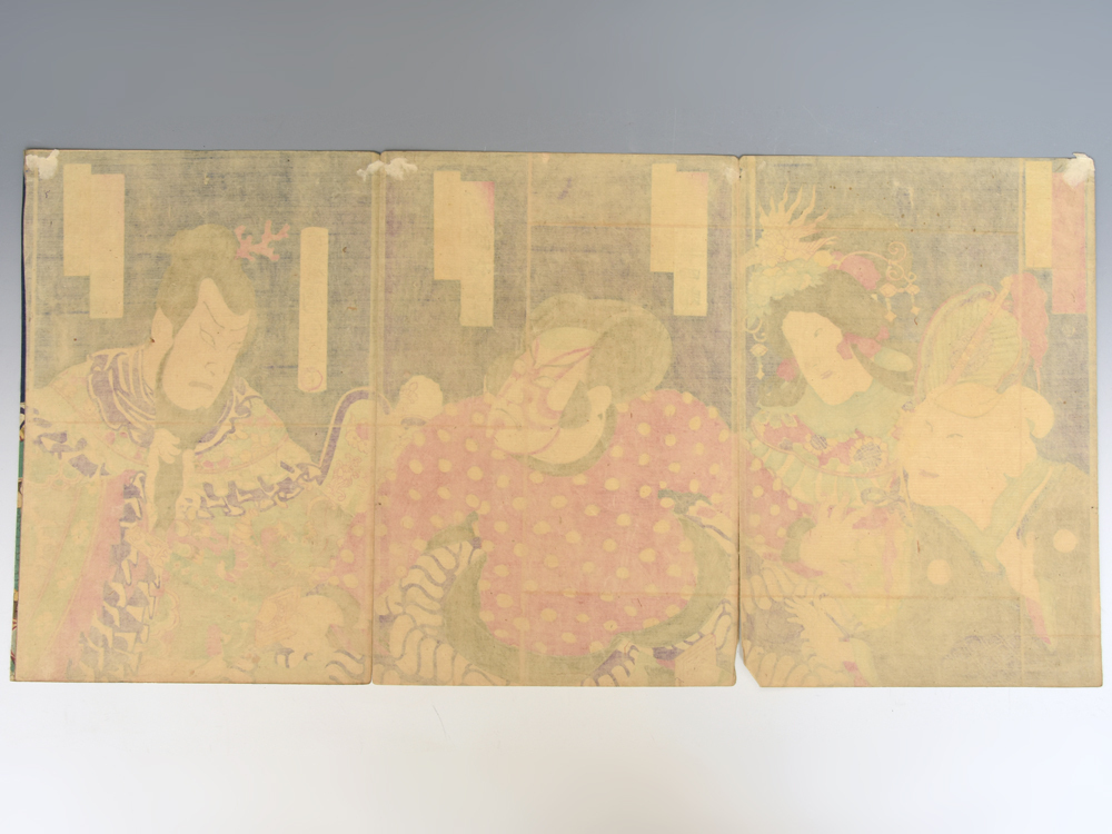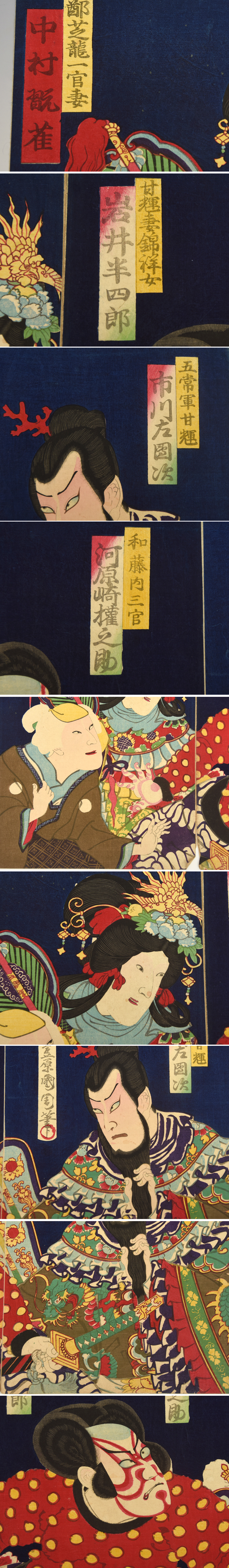 【真作】豊原国周 大判錦絵三枚続「国性爺合戦」 裏打あり 繋ぎあり 木版 明治版画 版画 浮世絵 錦絵 歌舞伎絵 |
