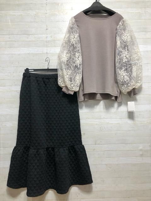 新品☆S~LL♪ボリューム袖リブトップス&キルトロングスカート〇B762