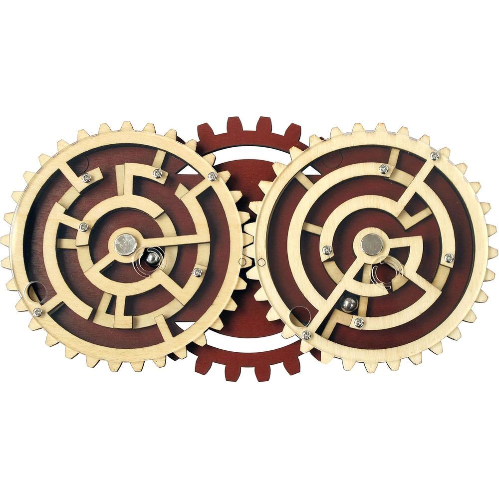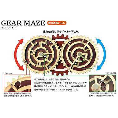 ギアを回して迷路を動かし、ボールが動く道を作り出して、最後にボールを盤から取り出します。ギア同士は連動している上に両側にボールが配置されているので簡単に思い通りには動きません。