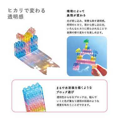 ■透明感のあるブロックは、組んでいくと色が重なり、透明水彩画の混色のような感覚を味わうことができます。