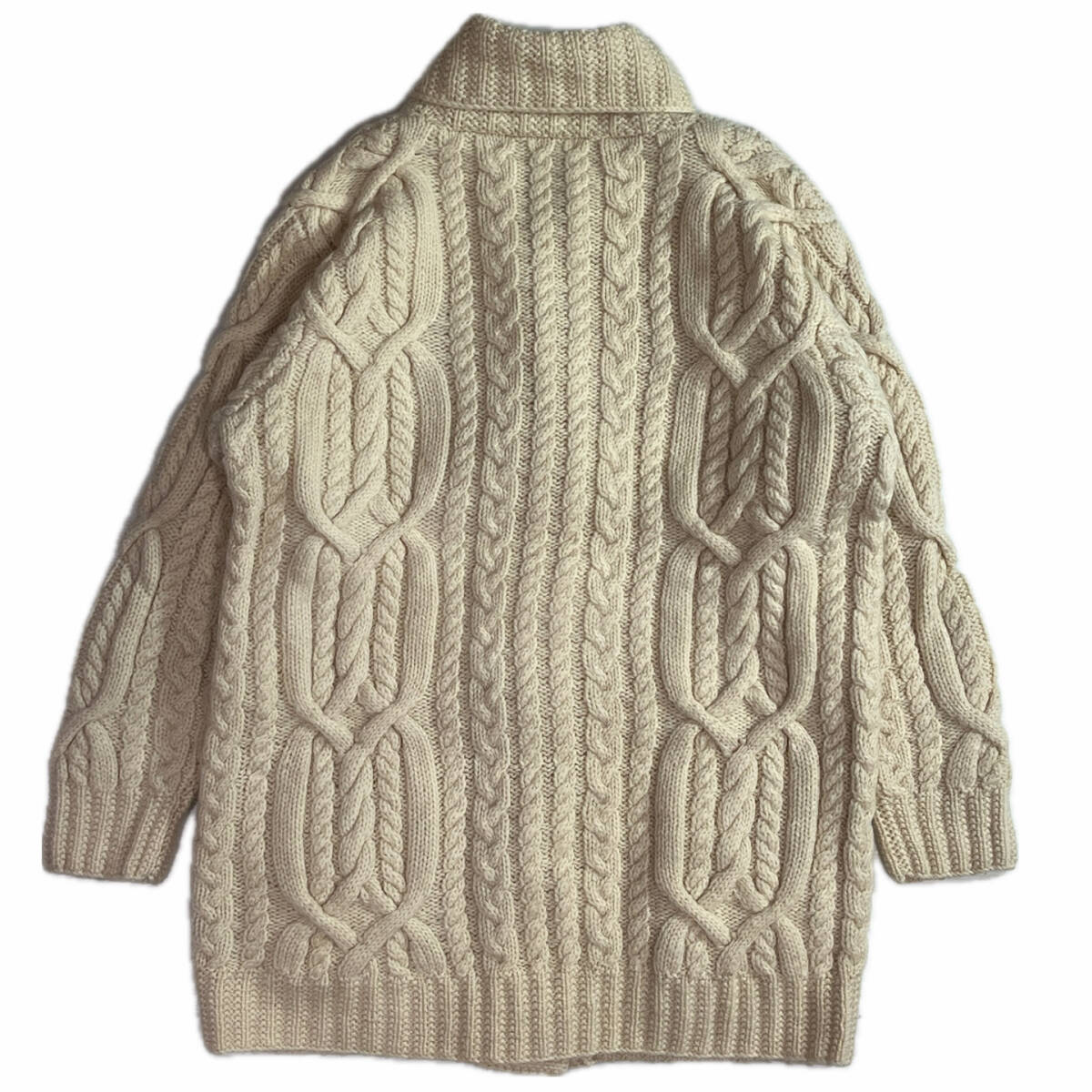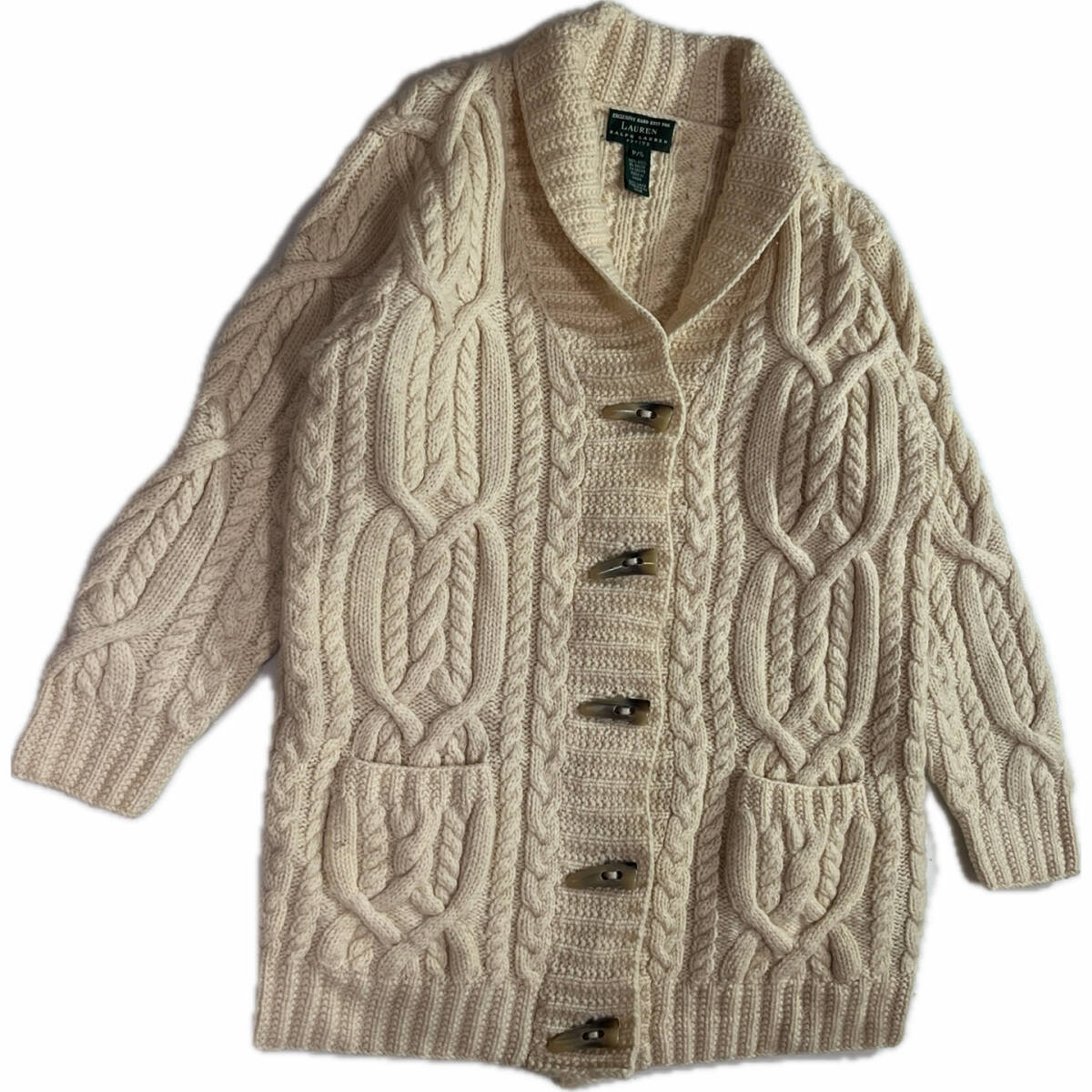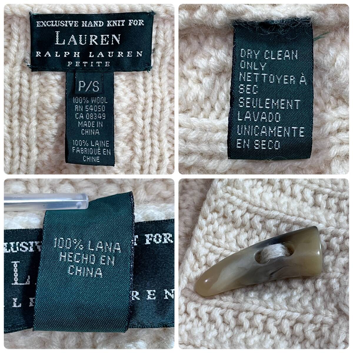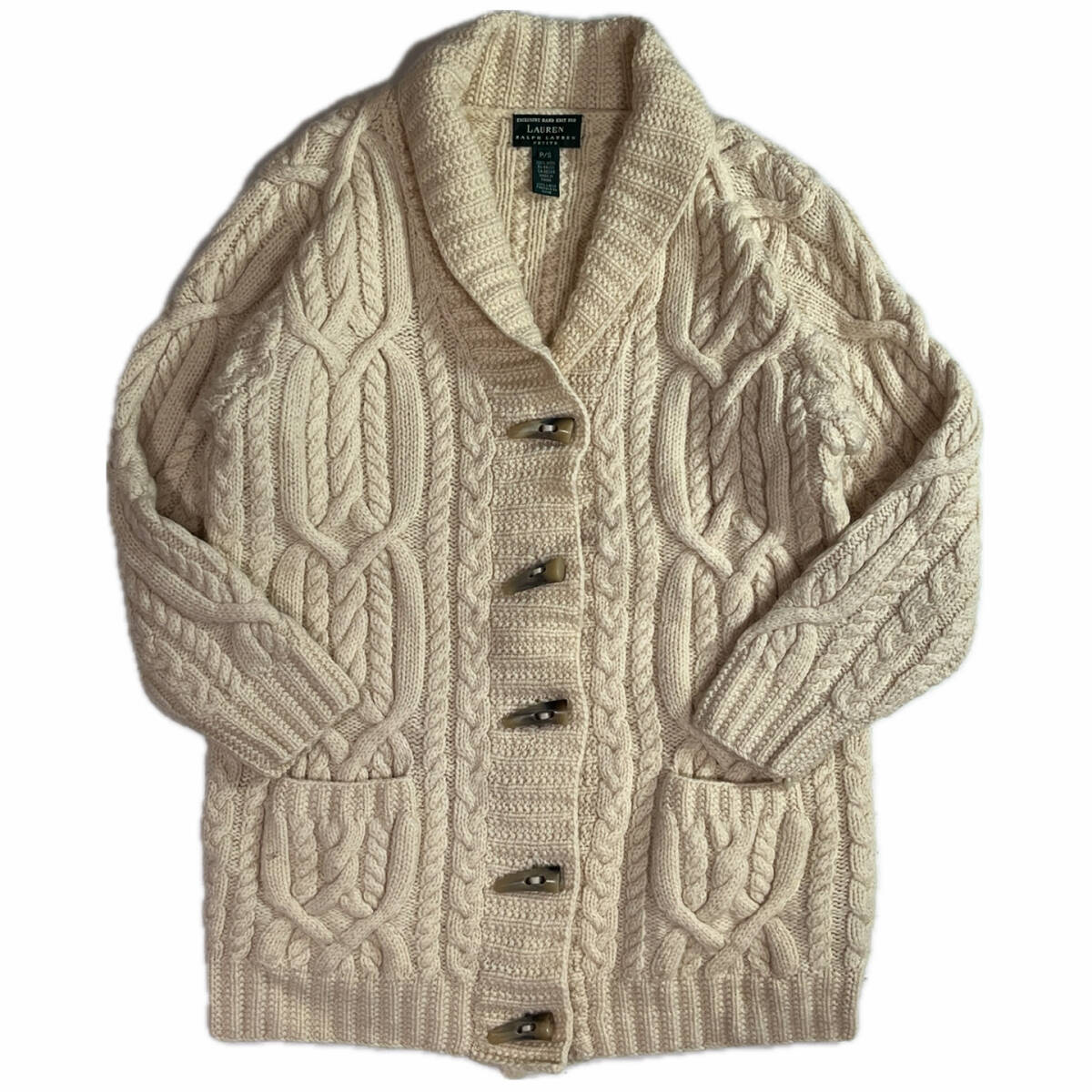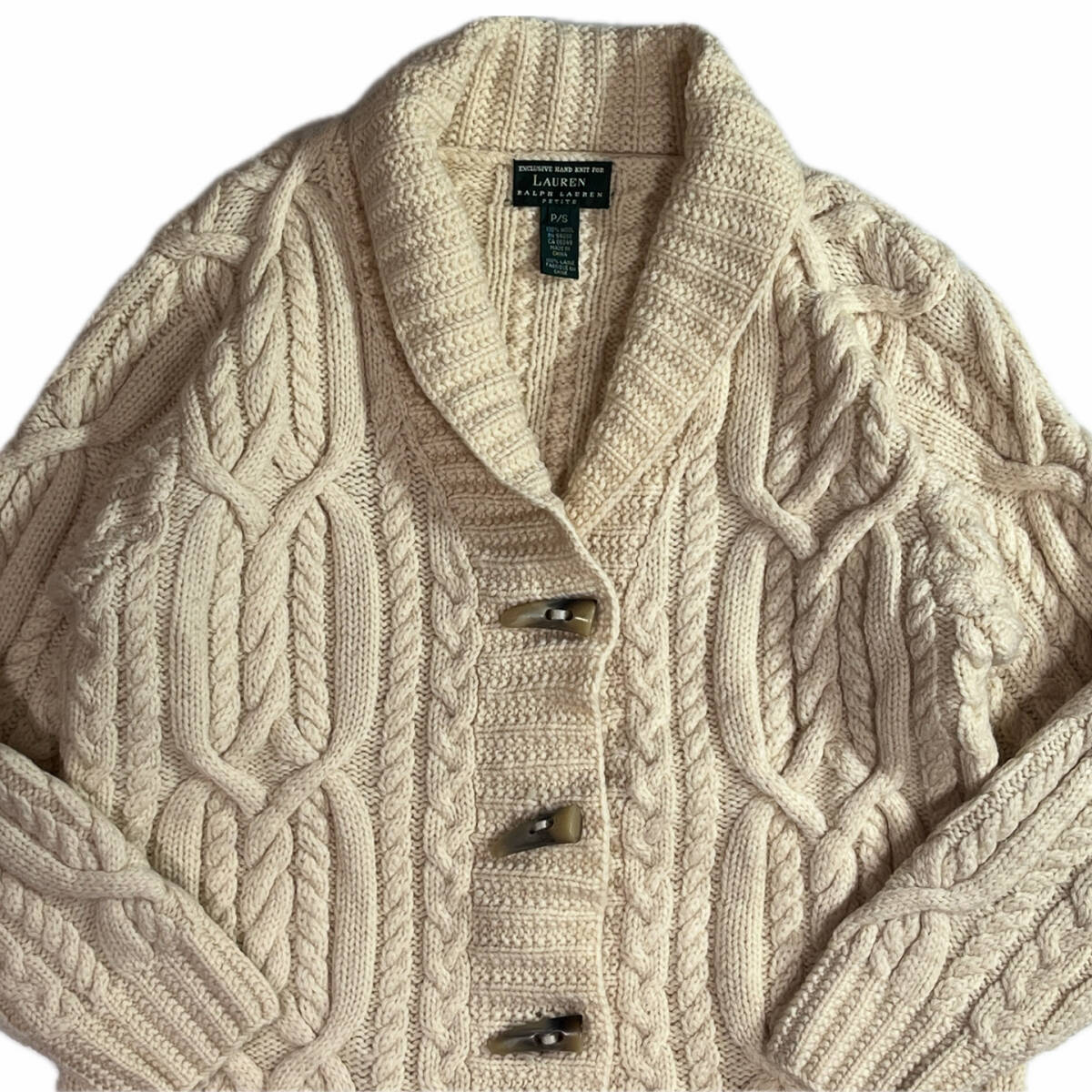 90s 90年代 メリノウール LANA WOOL 100% ショールカラー 鼈甲ドグル ポケット ミドル丈 アラン編み フィッシャーマン ケーブルニット カーディガン ニット セーター レディース 手編み ハンドニット EXCLUSIVE HAND KNIT FOR LAUREN RALPH LAUREN PETITE