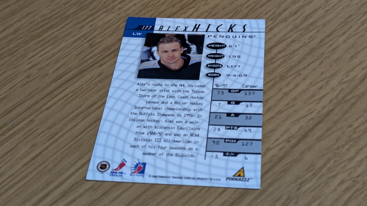 Alex Hicks 。カナダ出身。1969年9月4日生まれ。プロアイスホッケーの最高峰NHLのピッツバーグ・ペンギンズにて1995年〜2000年までの5年間通算258ゲーム出場。