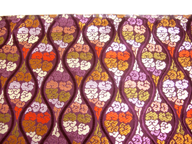 ●紫色立涌文様とその中に若草色・朱色などで雲文様を織り込んだ上品で華やかな金襴です