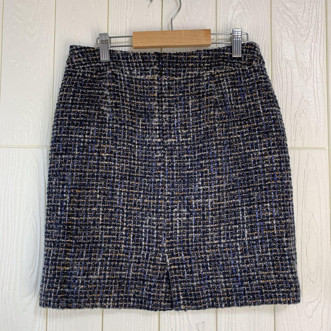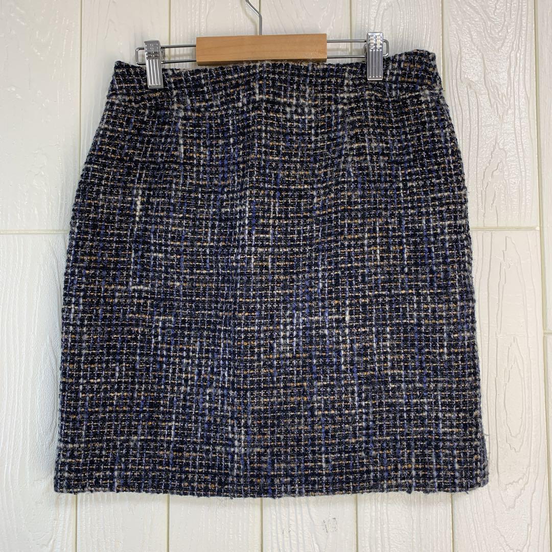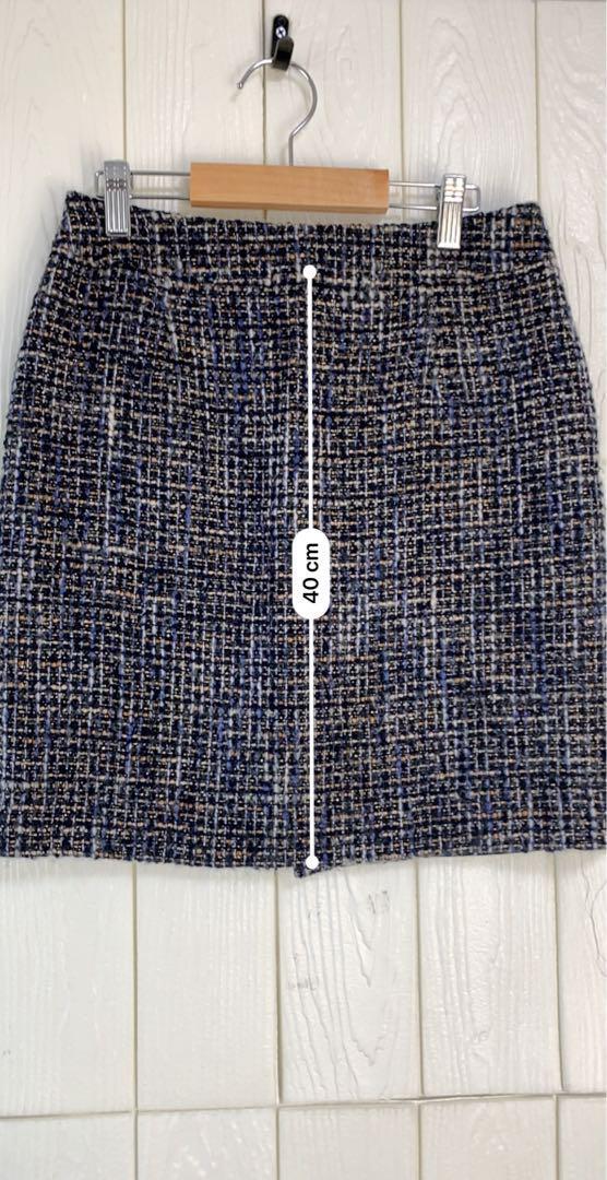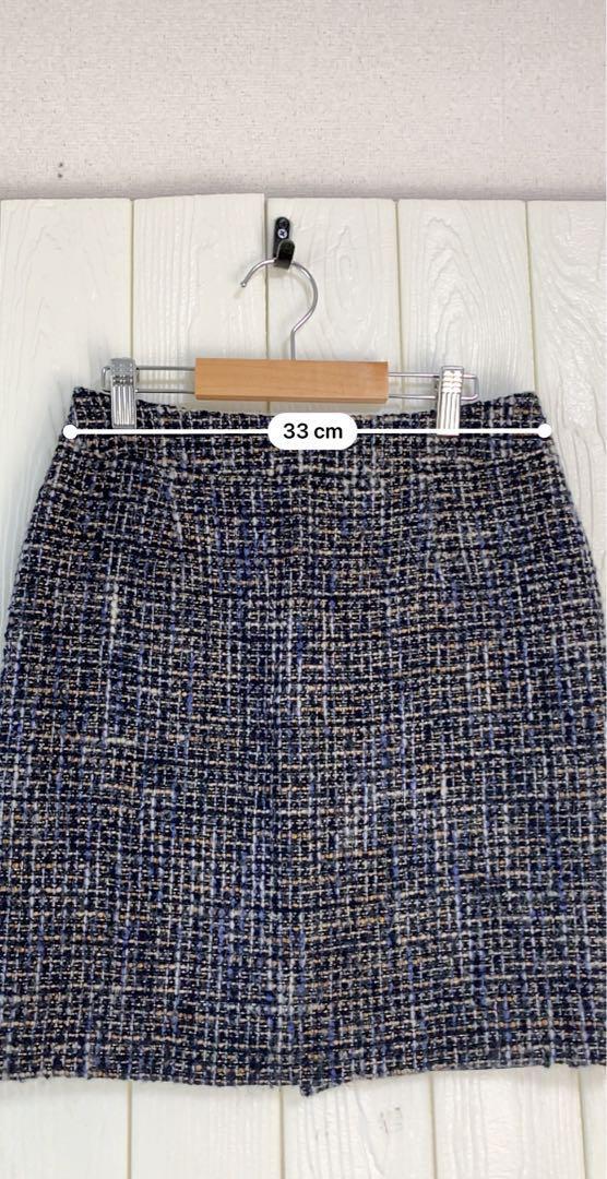ネイビー系ツイード素材のミニスカート、ウエスト66cm、丈40cm。