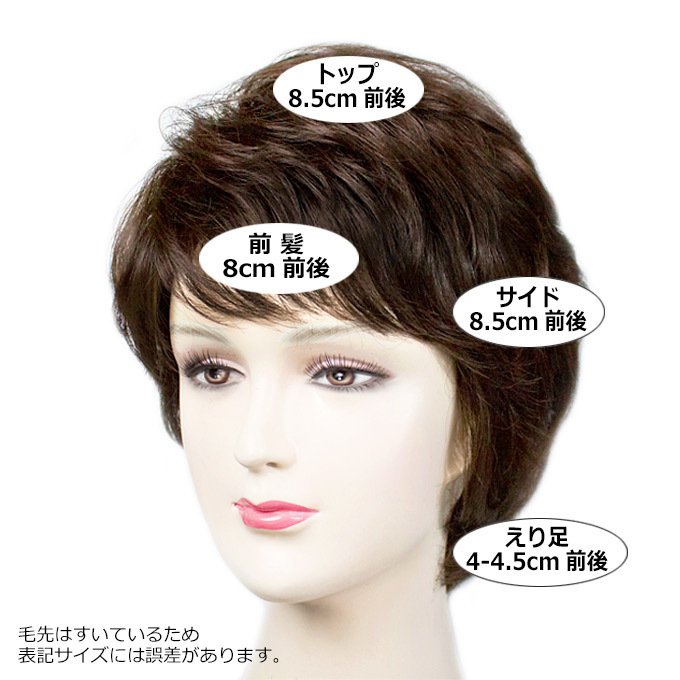 各部の毛長さは画像に記載いたしておりますが、毛先をすいているので多少の誤差があります。また、頭や顔の大きさや形状により襟足やサイドおよび前髪の毛先の位置が画像と比べ、上下することがあります。そのためイメージが異なる場合もございます。
