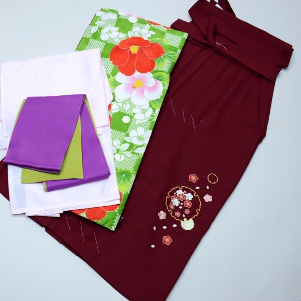 項目 | 着物袴フルセット(適合身長:135cm~143cm:ジュニア用へお仕立て直し致します。) ・二尺袖着物 ・二尺袖長襦袢(白地の半襟付き) ・重ね衿(着物についています) ・袴 ・袴下帯(リバーシブル両面使えます) |