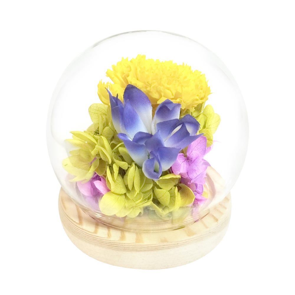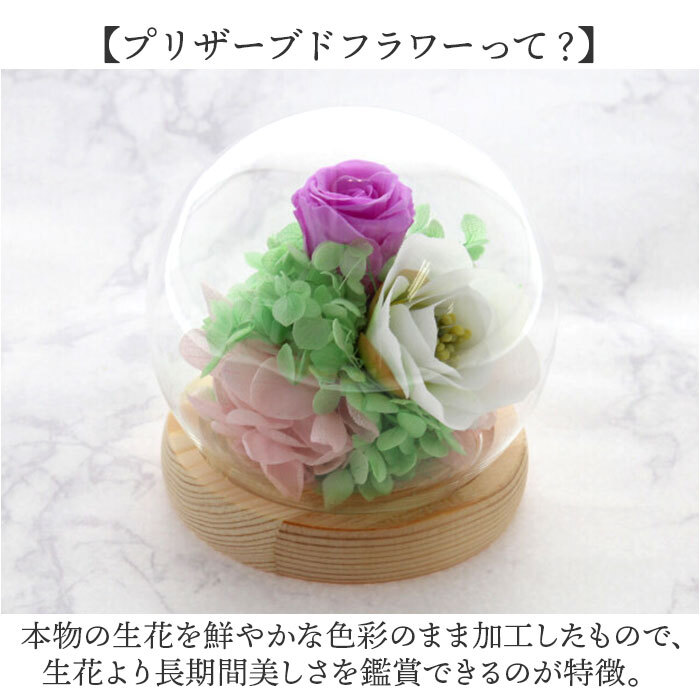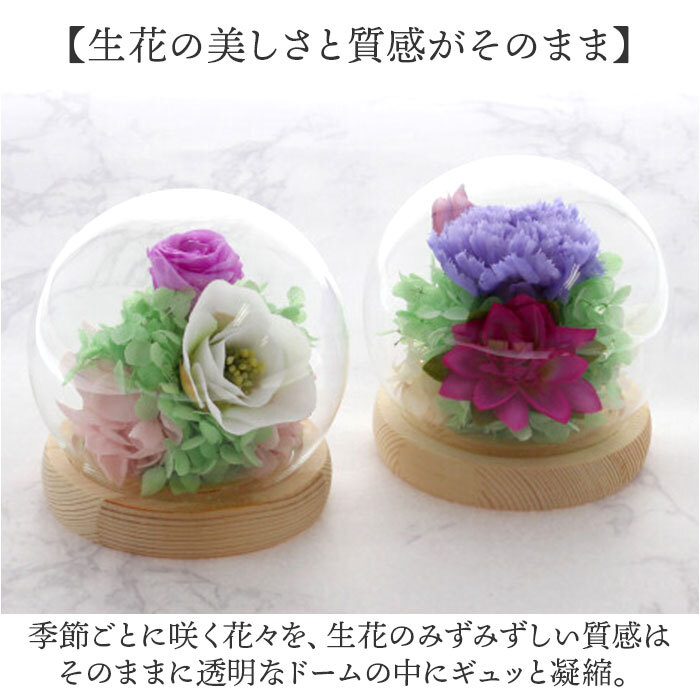 | 素材 | [プリザーブドフラワー、ドライフラワー]自然素材 [アーティシャルフラワー]ポリエステル、ポリエチレン [ドーム]ガラス [台座]木製 [フローラルフォーム]フェノール樹脂 |