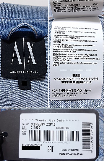 現在は並行輸入品でも、服の内部に付いた品質表示のタグには日本語で、【表示者 ジョルジオ アルマーニ ジャパン株式会社】と記されていることを理解しておいてください。また、輸入元の海外は日本ほど商品の扱いが丁寧ではありません。生地に若干のスレなどがある場合があり、目立つものは記しますが、目立たないものに関しては記しませんので、完璧な商品をお求めな方は正規店をご利用ください。