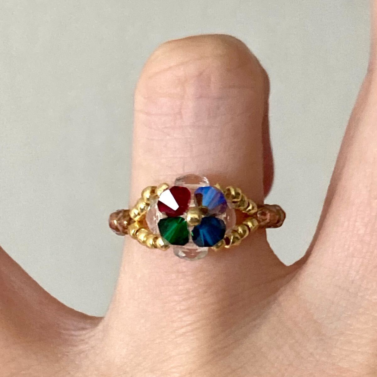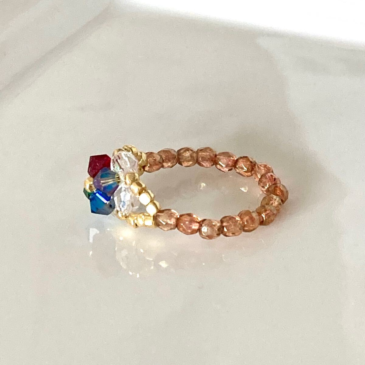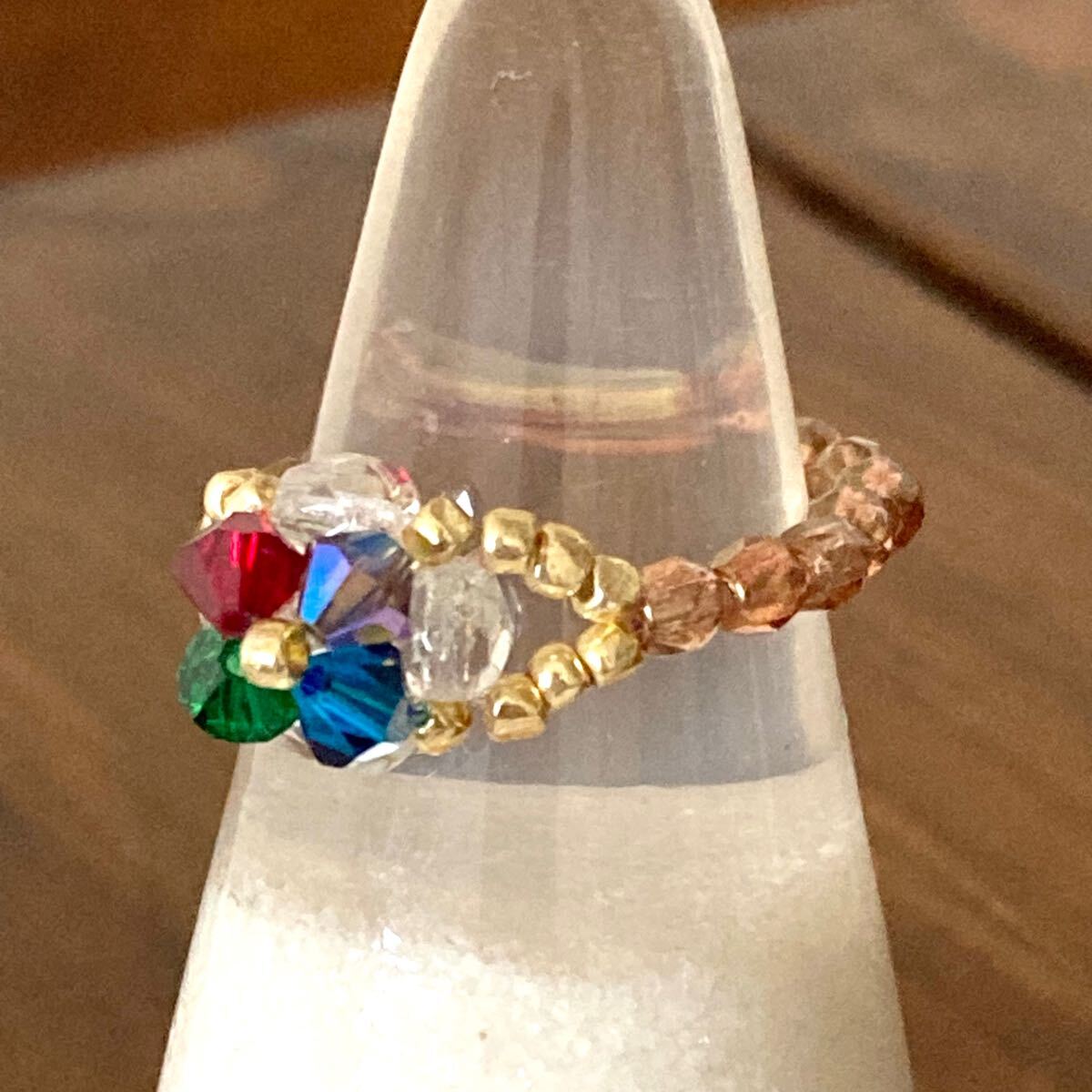 4mmの赤、ブルー、グリーン、パープルオーロラのスワロフスキー、4mmのクリアのチェコビーズ、3mmのピンクラスターのチェコビーズ、ゴールドのスリーカットビーズで作ったリングです。