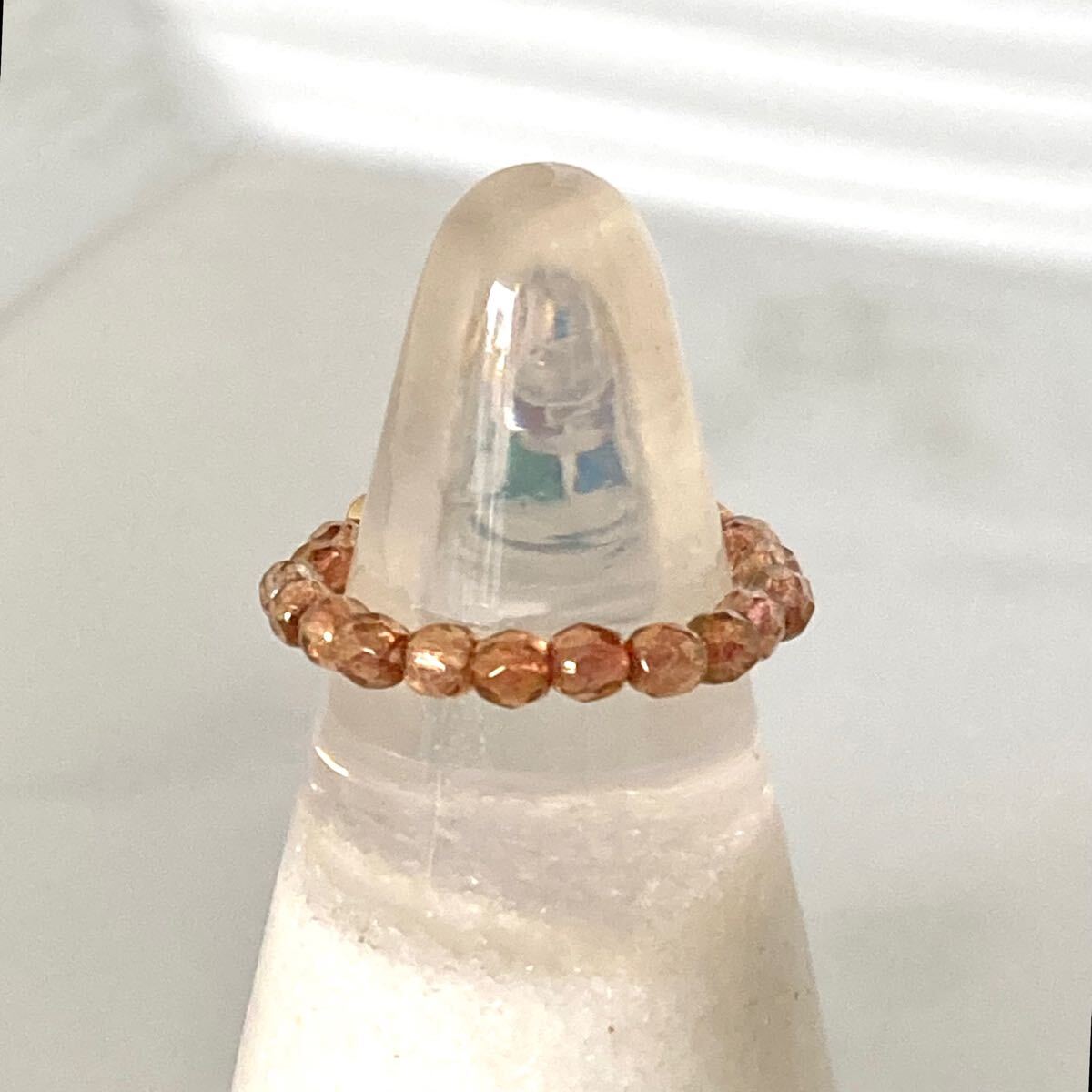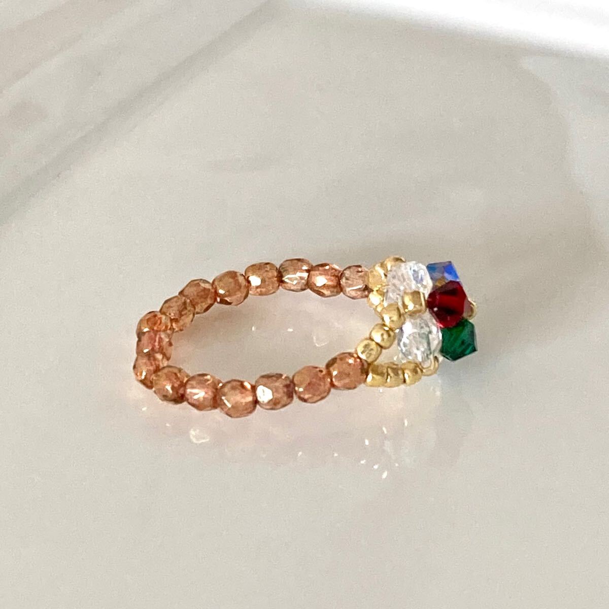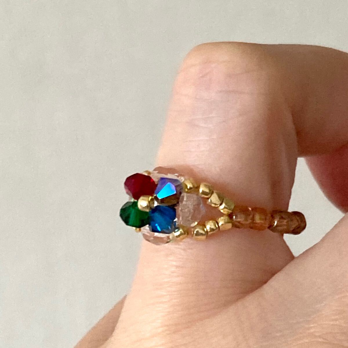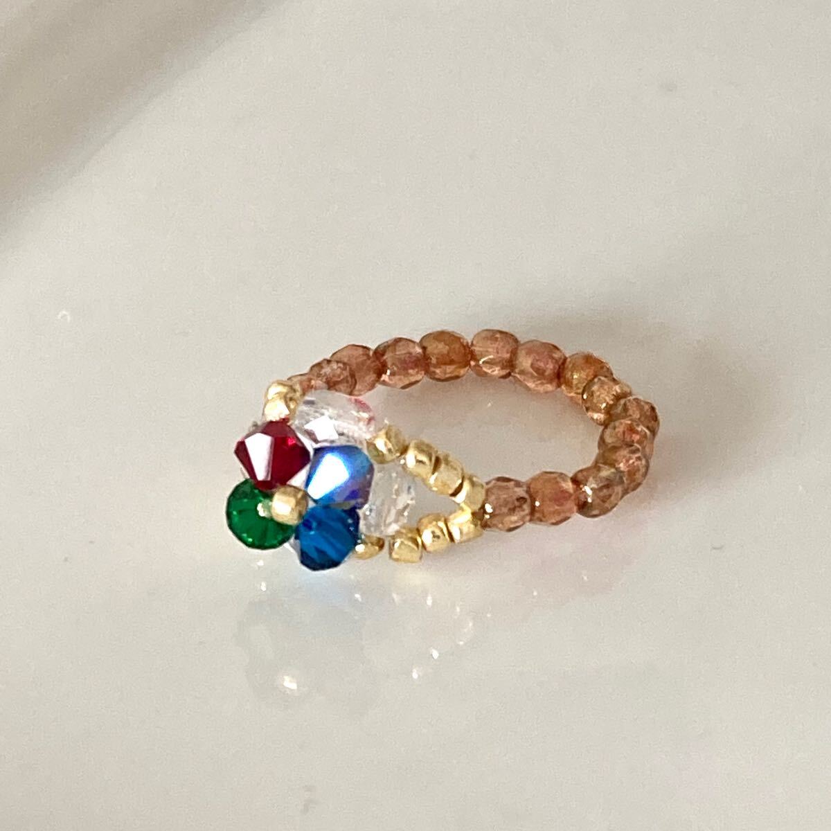 4mmの赤、ブルー、グリーン、パープルオーロラのスワロフスキー、4mmのクリアのチェコビーズ、3mmのピンクラスターのチェコビーズ、ゴールドのスリーカットビーズで作ったリングです。