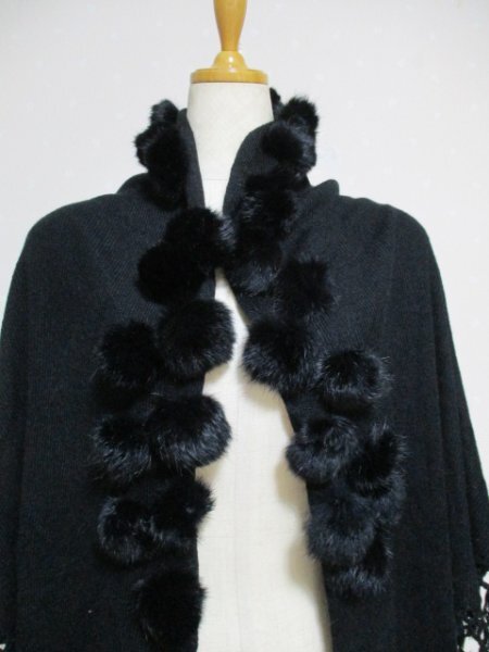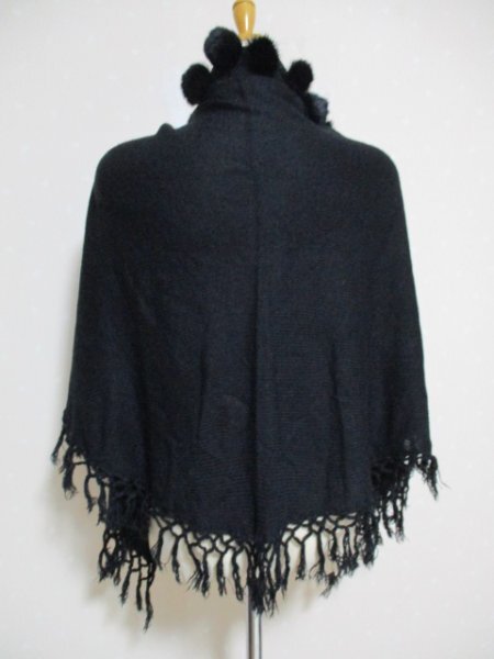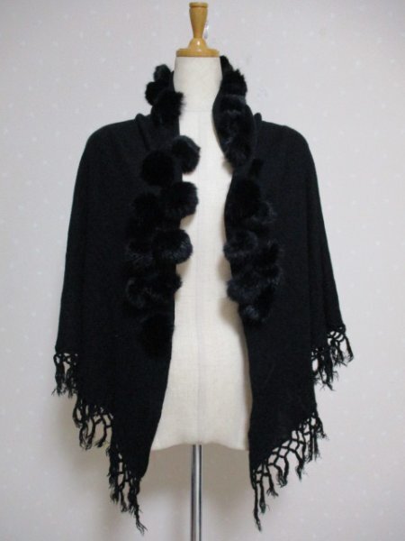 ● 三角ストール ● ポンポンラビットファー付き大判 ニット ■ 黒(41123)