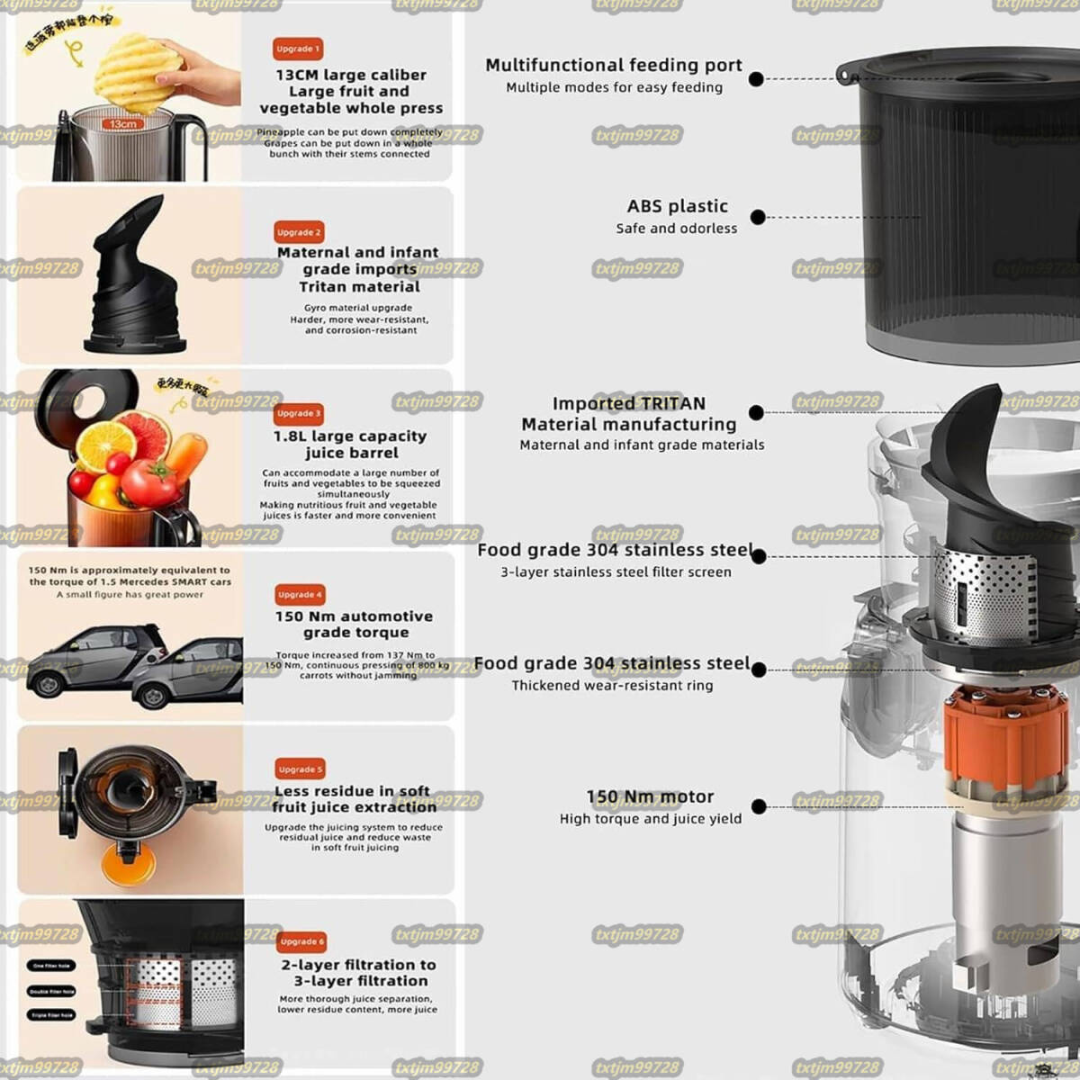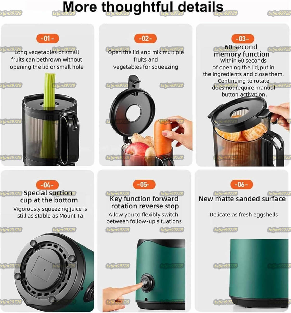 【ジューサーマシンスラグジュース分離】:このジューサーは、自動車グレードのトルク137.6 Nmを利用してゆっくりと絞り、ジュースからカスを効果的に分離し、果物や野菜の細胞壁へのダメージを最小限に抑えます。これにより、沈殿物、酸化、栄養素の損失が少なくなり、ジュースの純度と味が向上します。