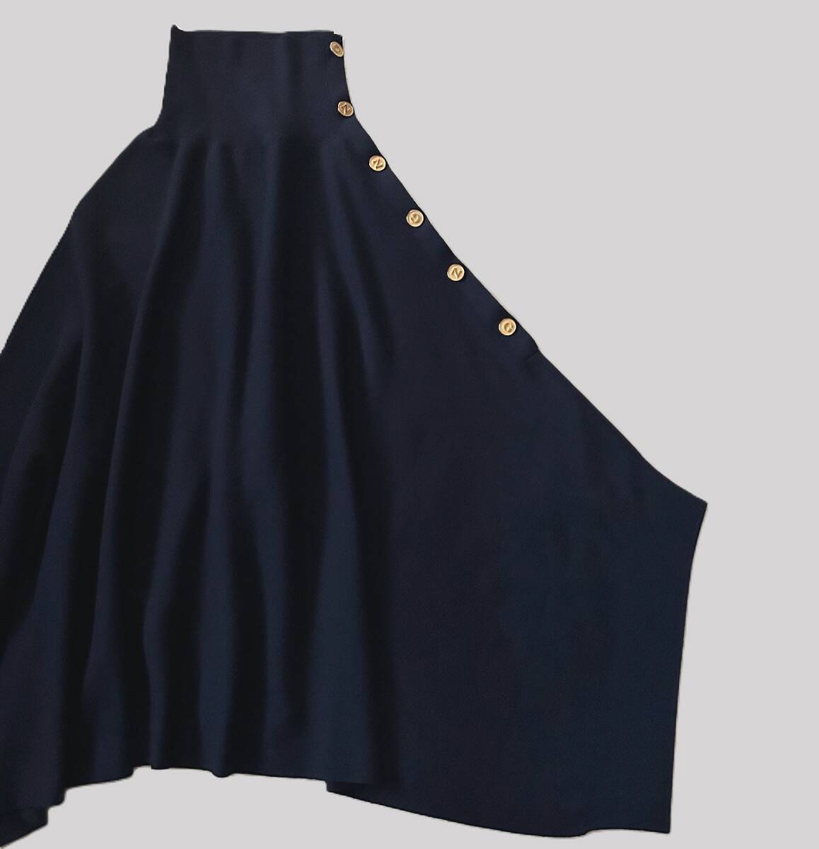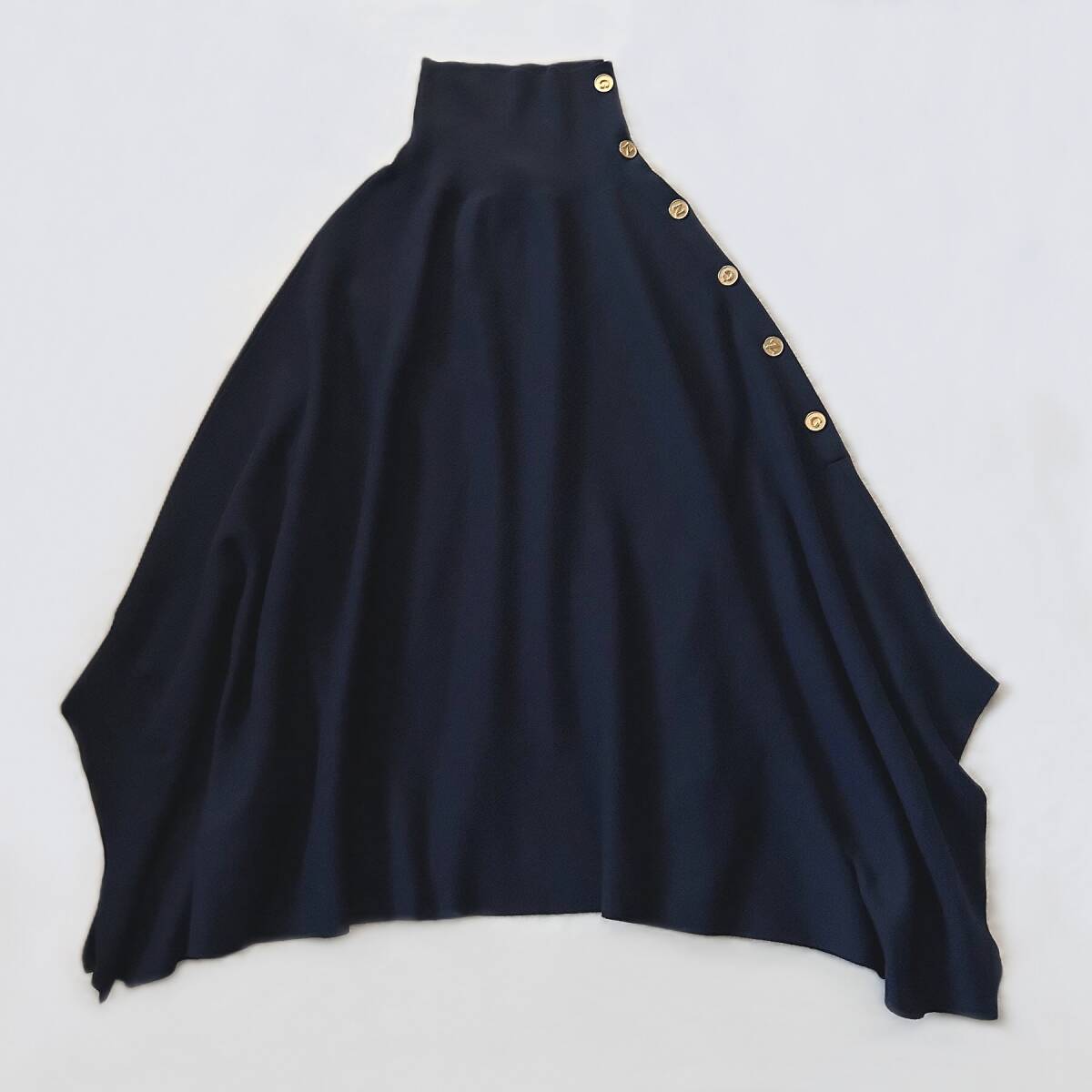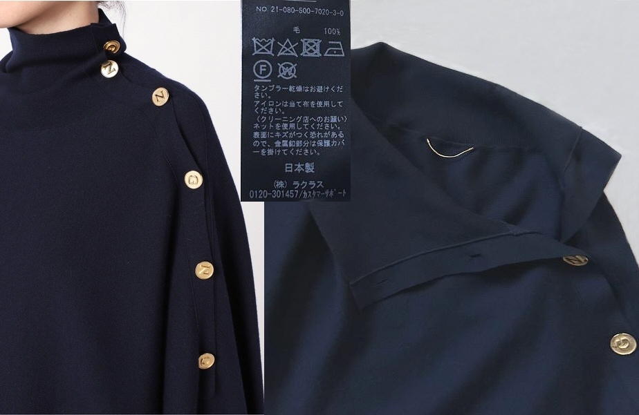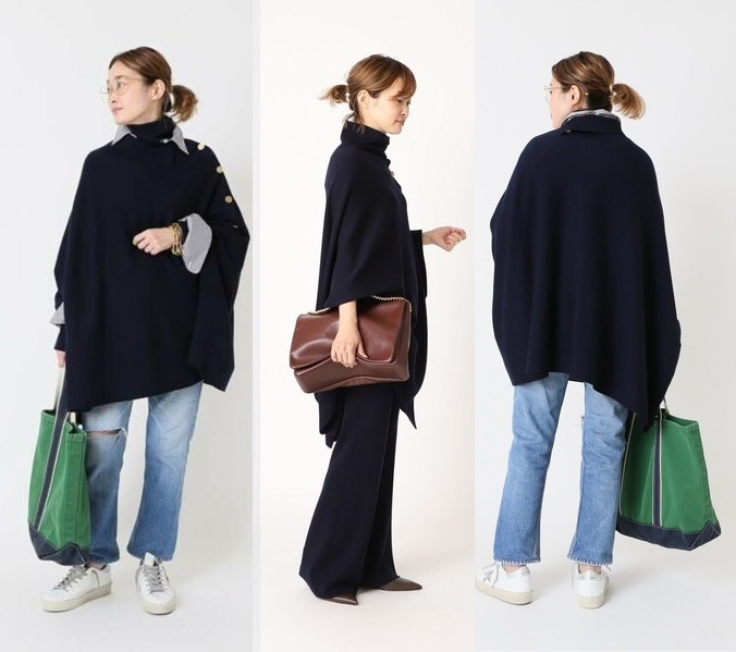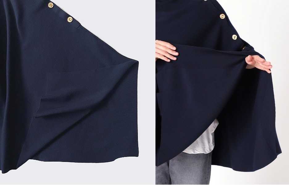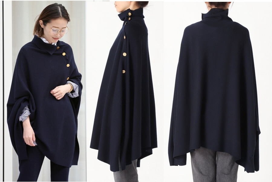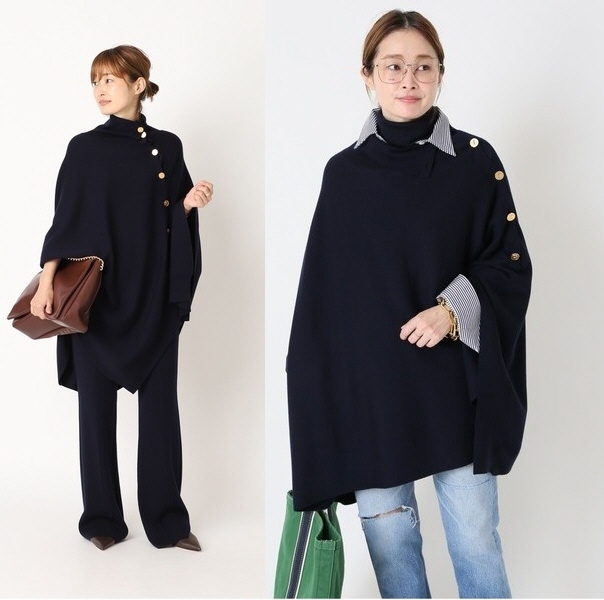 オリジナルのゴールドボタンをつけることで、クラシックなムード漂うポンチョ。