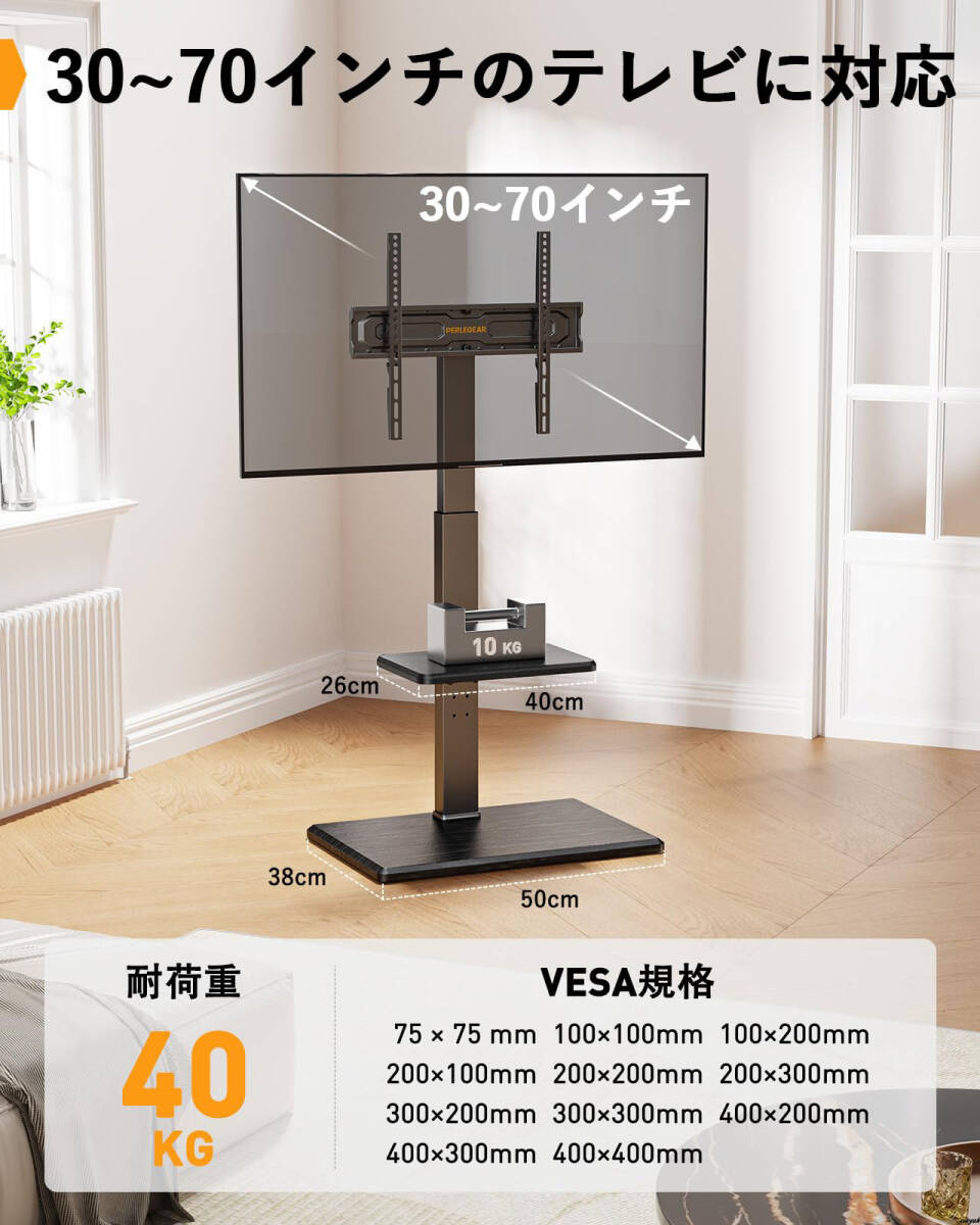 30~70インチのテレビに対応する壁寄せテレビスタンドです。