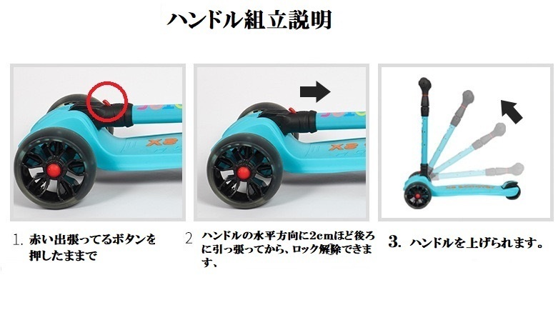 商品を折り畳んだ状態で、赤い出張ってるボタンを押したままで、ハンドルの水平方向に2cmほど後ろに引っ張ってから、ロック解除できます、 次にハンドルを上げられます。