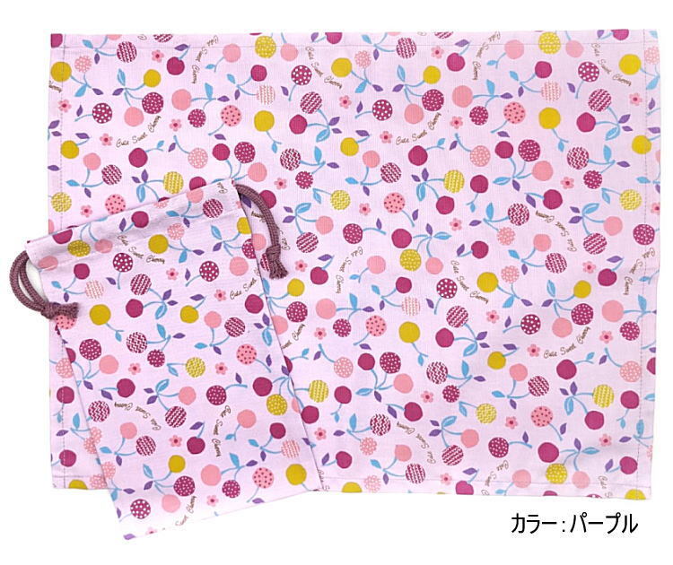 給食袋(巾着袋MS)+ナフキン(長方形) 2点セット【北欧風 ポップチェリー柄 パープル】ランチクロス コップ袋 はし袋 箸袋 ポーチ 日本製