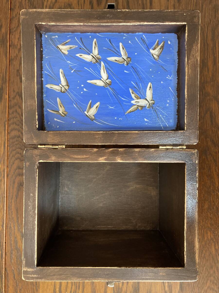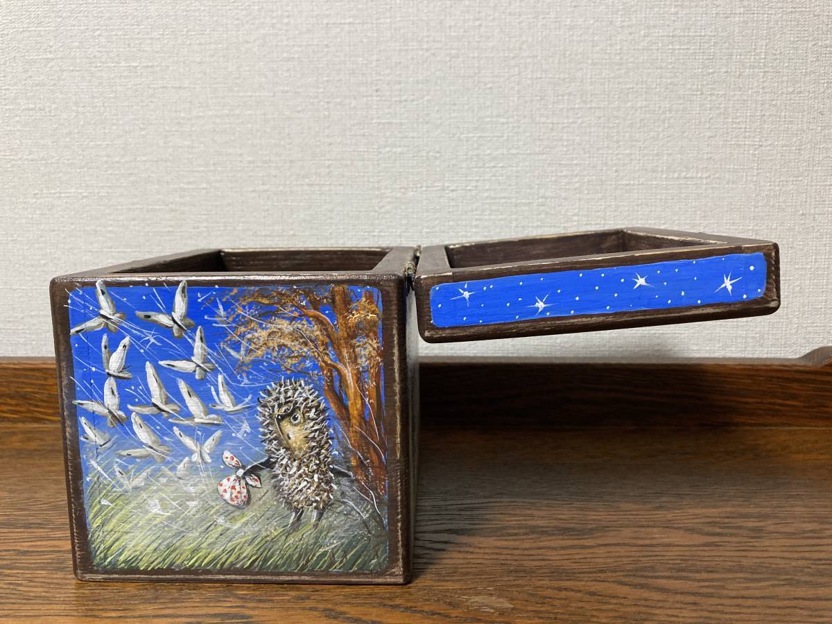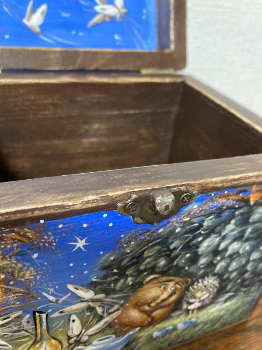 シャビーシックなあつらえの木箱にハリネズミのヨージックがコグマ、白い馬、ワシミミズク、カタツムリ、カゲロウなど様々な動物と出会う物語がそのままにテンペラでハンドペイントされています♪