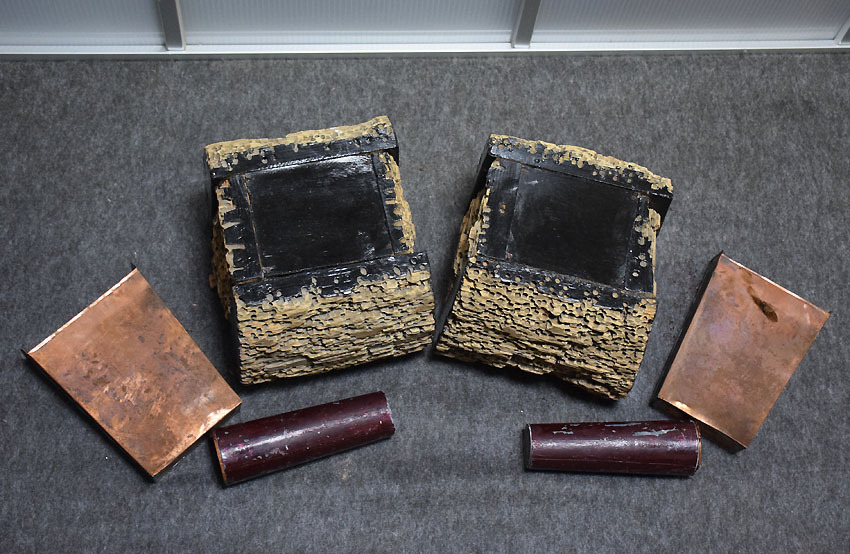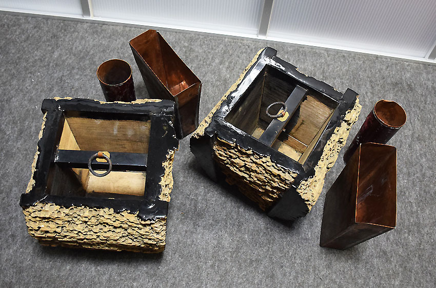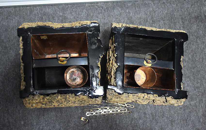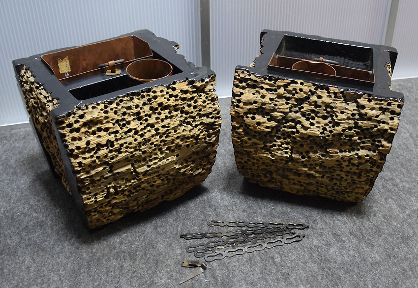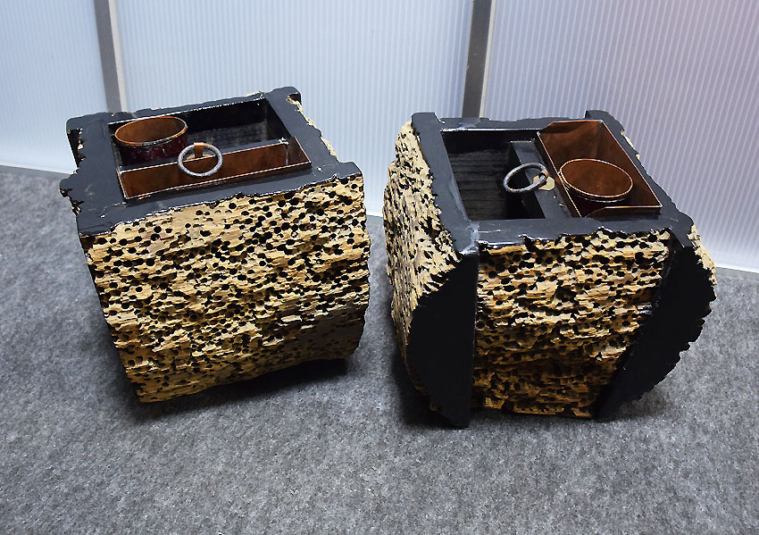 ☆ご覧いただきましてありがとうございます。 ご入札いただく前に、必ず商品説明を最後までお読み下さい。☆ ☆希少なフラワーベース2個セットです。 外観に虫食いされたような穴が多数、 中には銅の花器がついてます。 サイズ:約 高さ19.5cm×横21.5cm×奥行き20.5cm 重量:約 2.4kg 付属品は写真のもので全てです。 経年により汚れや剥がれ、傷、使用感あります。 ※詳しい詳細は不明です。 画像でご確認の上、興味ある方、 探していた方、現状にてご検討ください。 | |||