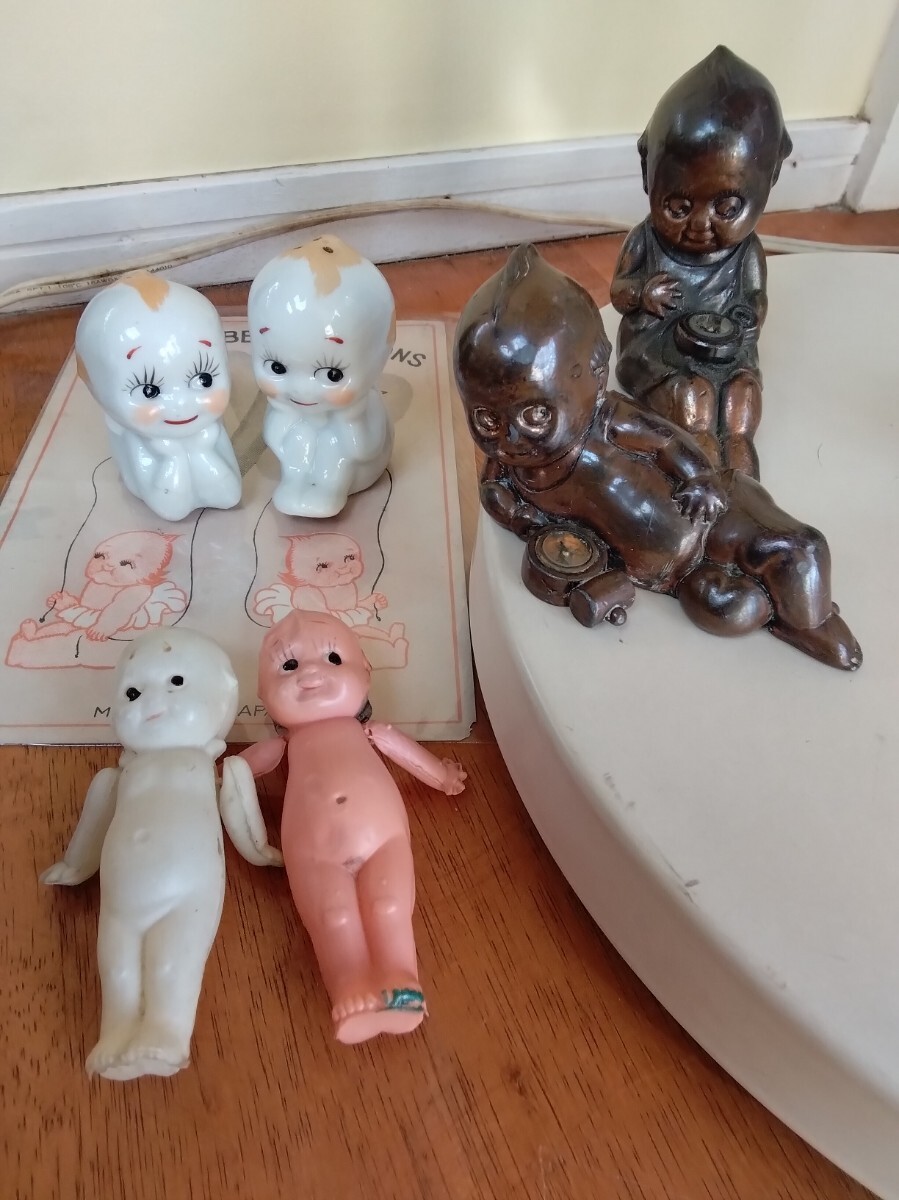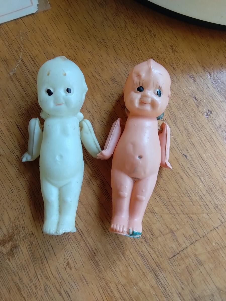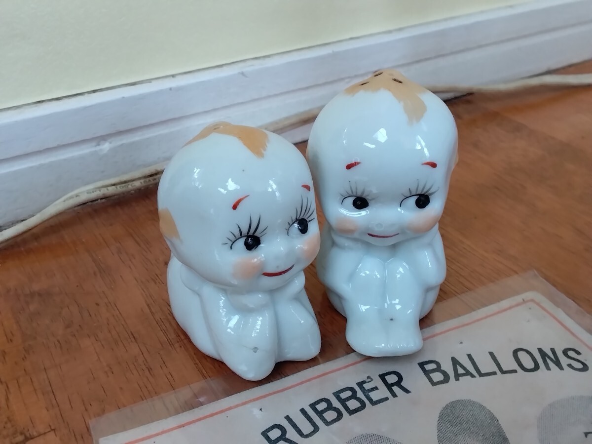 ビンテージ 戦前~戦後 made in Japan 小さなキューピー人形 6個+ラベルまとめて QP 昭和レトロ セルロイド ビスクドール S&P メタル コンパス 塩コショウ入れ アンティーク オブジェです。戦前~戦後にかけてのキューピー人形とラベルです。。ラベルが一番古く大正期頃、次にメタルキューピー、ビスク、セルロイドの順です。メタルキューピーのペアは方位磁石両方ともちゃんと回っています。セルは少しへこみあり、ビスクペアは塩コショウ入れでハンドペイントです。メタルセル共Japanの刻印あります。全体に状態良い方ですが時代なりの古味ついています。画像ご確認下さい。長期自宅保管の古いものである事をご理解頂ける方に。サイズ(セルロイド)7センチ。ご質問には誠意を持ってお答え致しますのでノークレームでどうぞよろしくお願い致します。他にも出品しておりますのでよろしければ御覧下さいね。