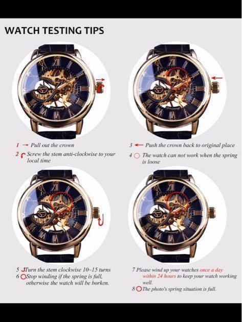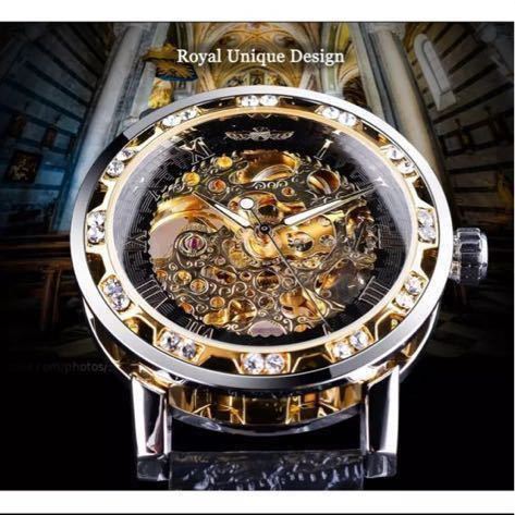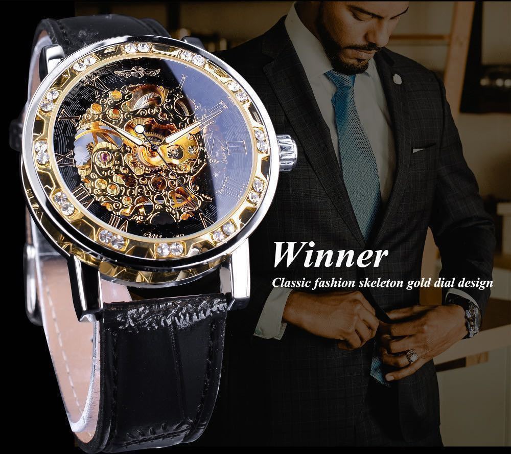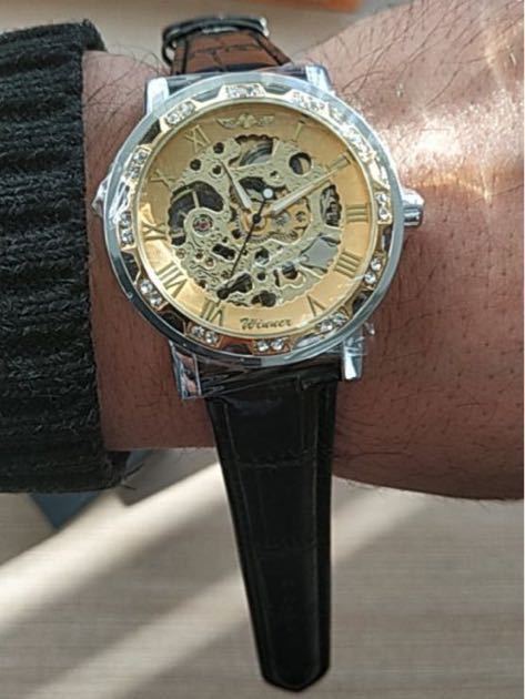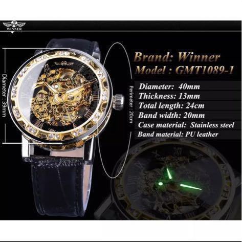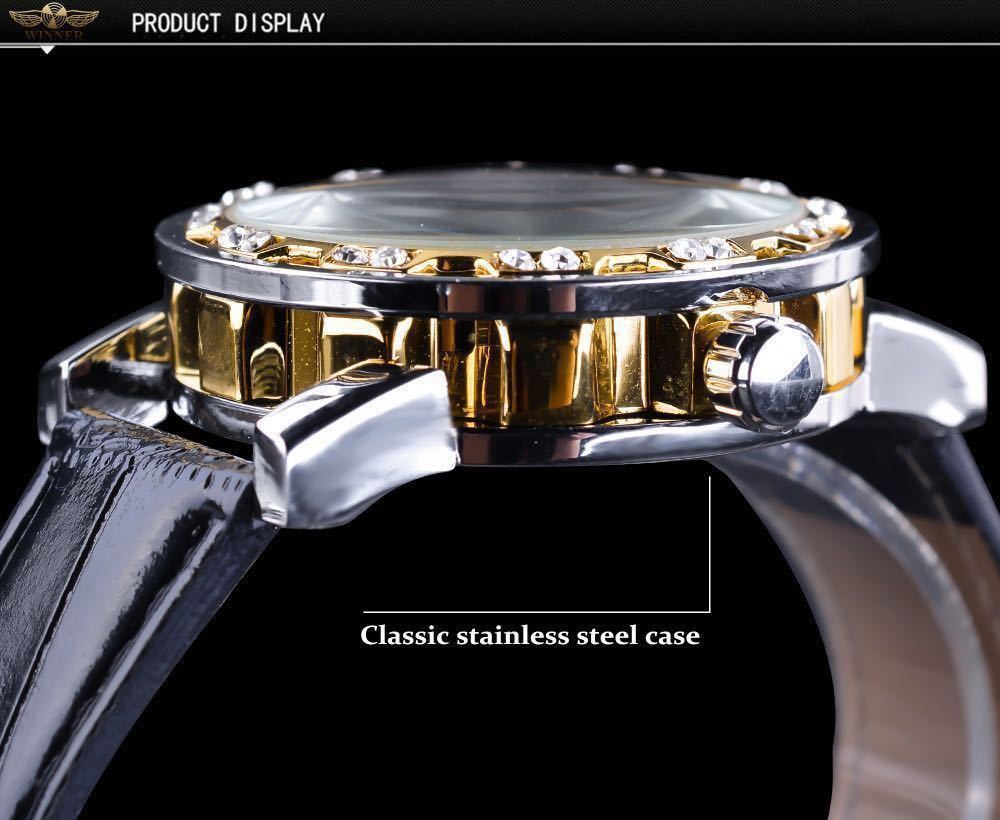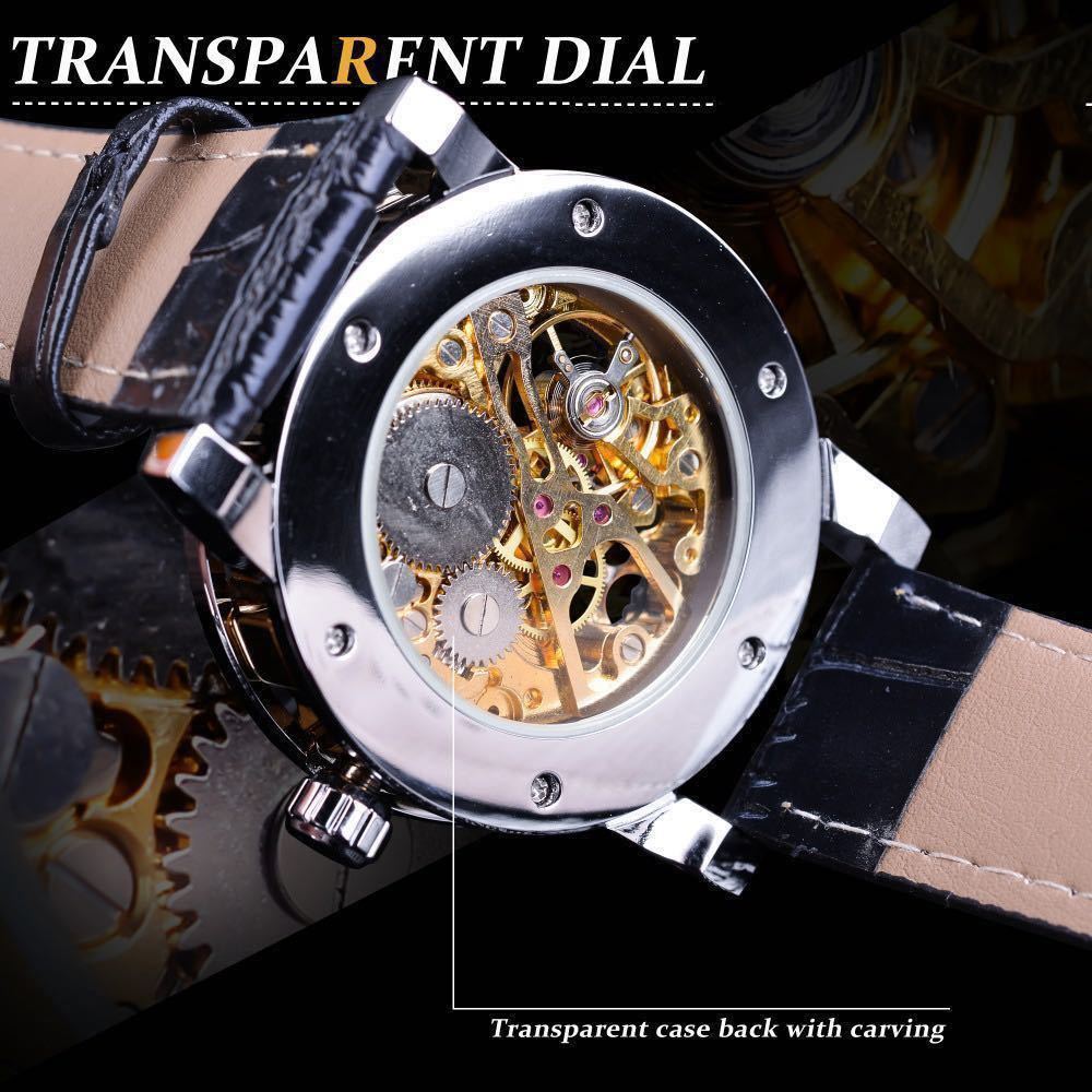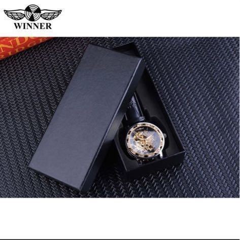 J285★海外トップブランド WINNER メンズ高級腕時計 機械式スケルトンダイヤル レザーバンド ゴールデンホワイト