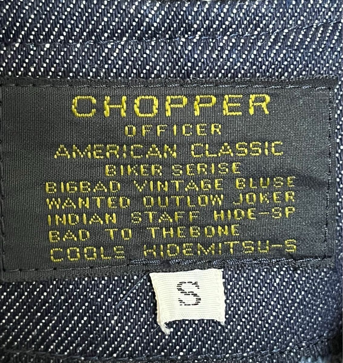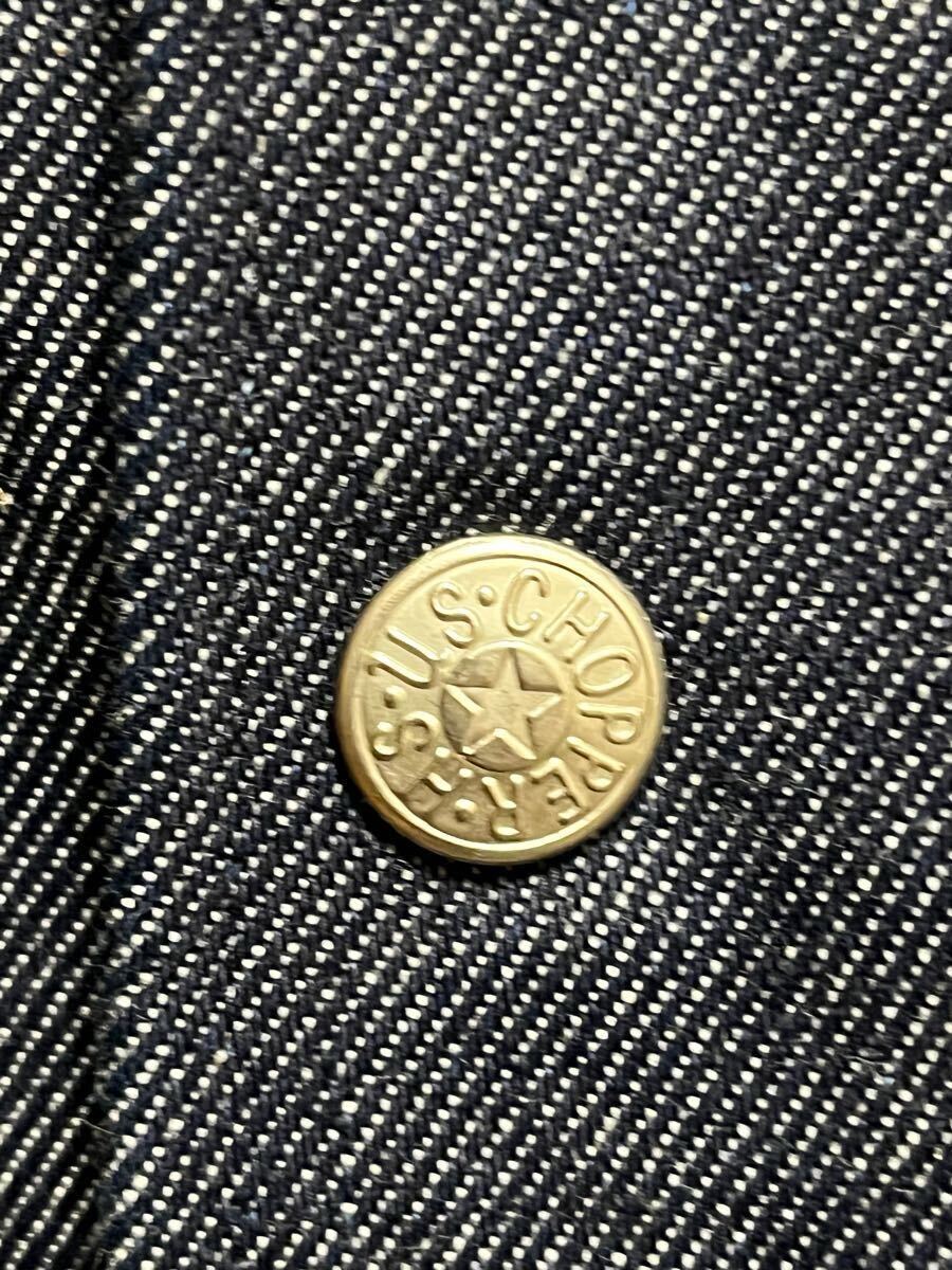 ブランド名 CHOPPER・表記サイズ S・肩幅 51cm・身幅 54cm・着丈 81cmです。以前出品したブラックデニムの物もかなり程度が良い方でしたが、こちらは更に状態が良く、ほぼ着用感がありません。右胸に薄っすらと小さなシミがありますが、目立ちません。