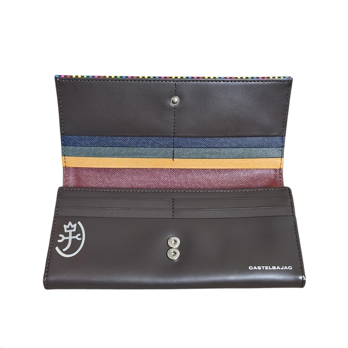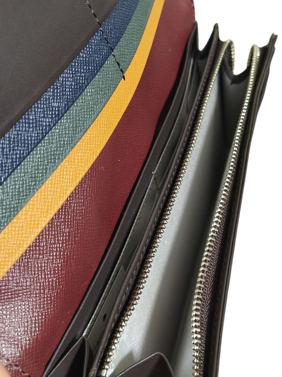 特徴的なストライプ柄のプリントをかぶせ蓋の縁の部分にプリントされたおしゃれな長財布。開くと内側にバジャックカラーがさりげなく配色されている、ブランドらしさ満載のデザインとなっています。