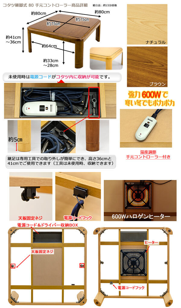コタツ 継脚式 手元コントローラー 80 正方形 ブラウン MYK-T80-BR