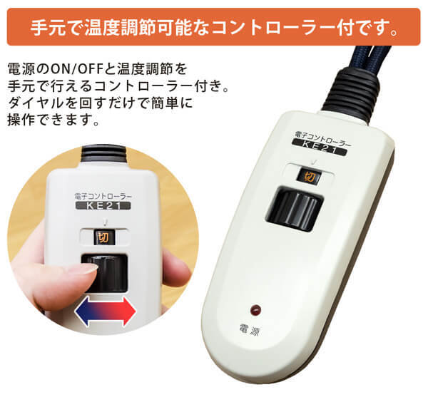 電源ON/OFFと温度調節を手元で管理できるコントローラー付き!