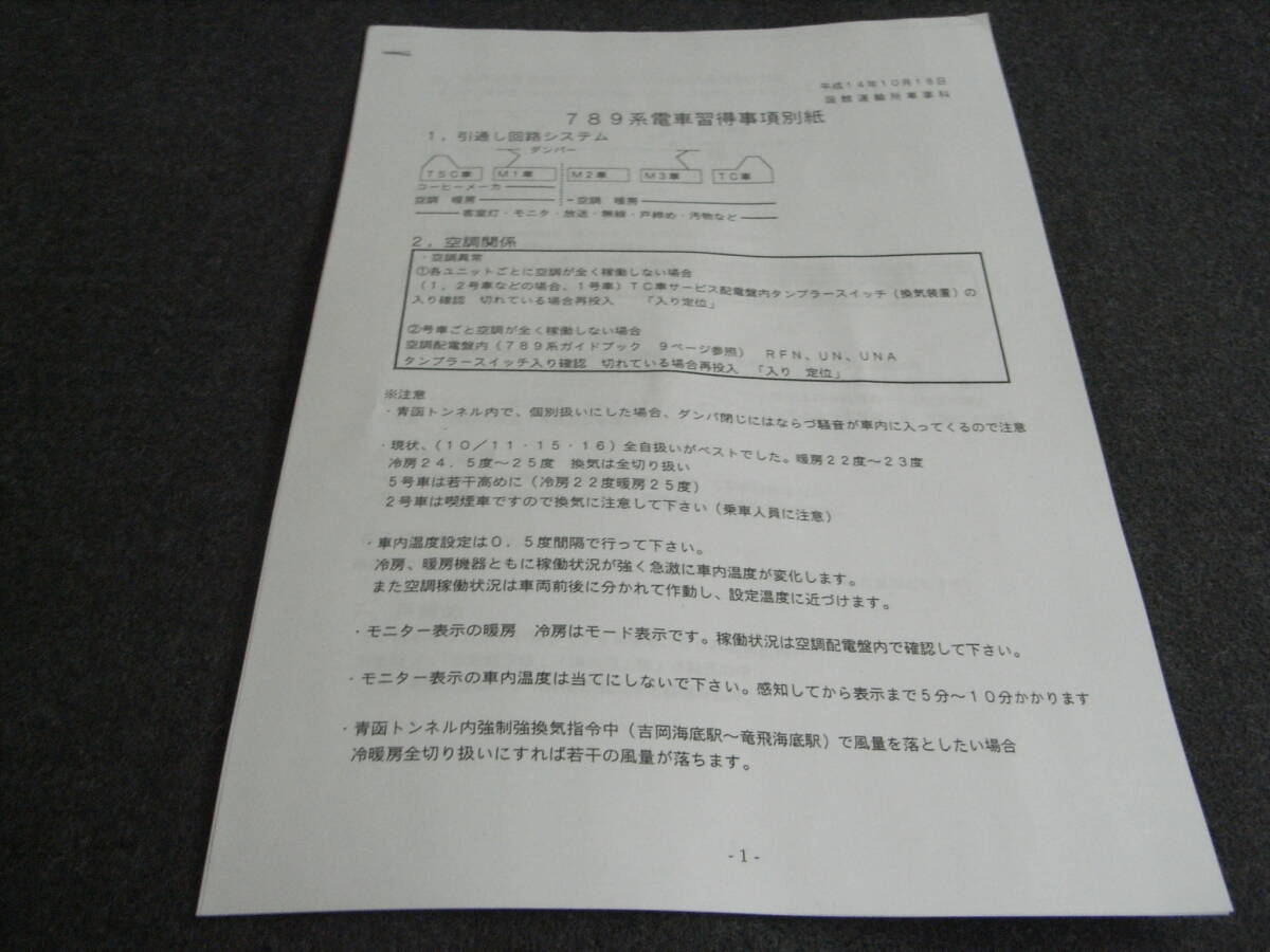 789系電車習得事項別紙 平成14年 函館運輸所車掌科 JR北海道