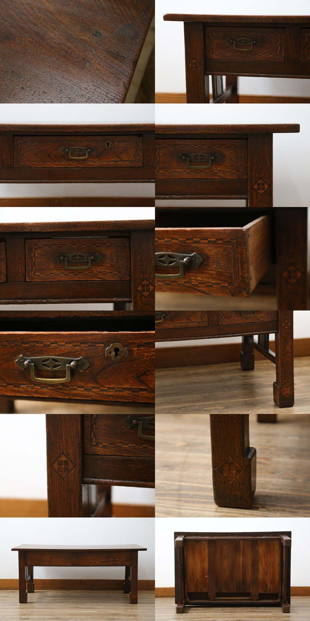 和製アンティーク 象嵌入り 栓材 味のある風合いが魅力の文机(ローテーブル、デスク、座机、作業台、平机、ワークデスク、在宅用、在宅ワーク用)(R-074634)