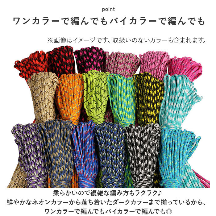 | 商品説明 | ・・ハンドクラフトに最適!柔らかく編みやすいパラコード31m! ・【ハンドメイド用に★】 ・わんちゃんのリード用や、ブレスレットなどのハンドメイド用に★ ・【ワンカラーで編んでもバイカラーで編んでも】 ・柔らかいので複雑な編み方もラクラク♪鮮やかなネオンカラーから落ち着いたダークカラーまで揃っているから、ワンカラーで編んでもバイカラーで編んでも◎ ・【素敵なハンドメイドライフを】 ・プチプラなので、色んなカラーを揃えて素敵なハンドメイドライフを楽しんで♪ ・※こちらはハンドメイド用の商品となります。キャンプや登山など、アウトドアでのご利用はお控え下さい。 |