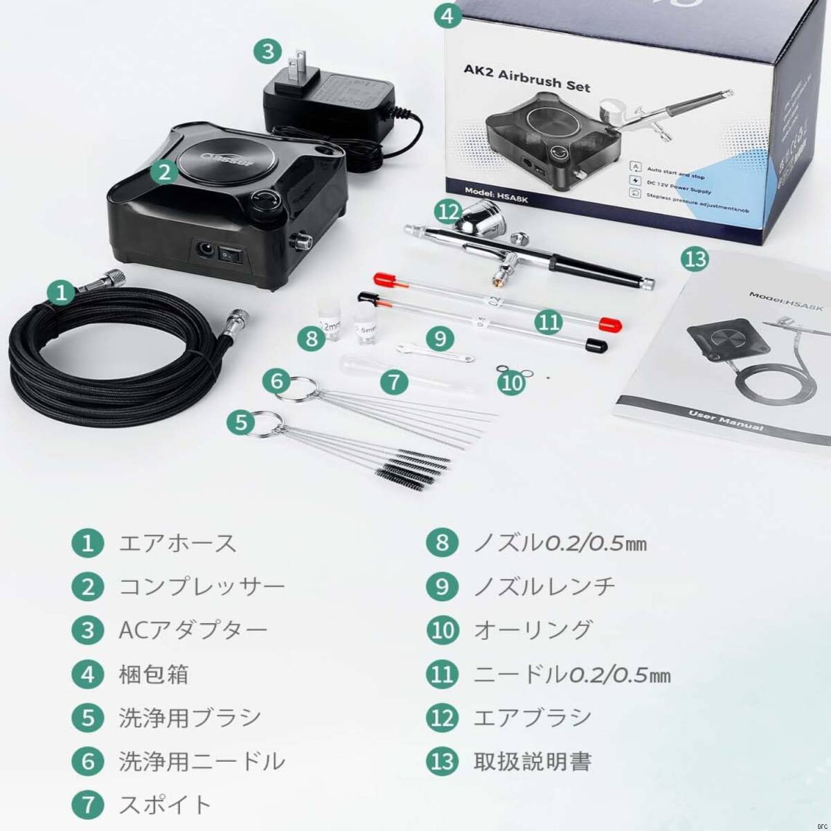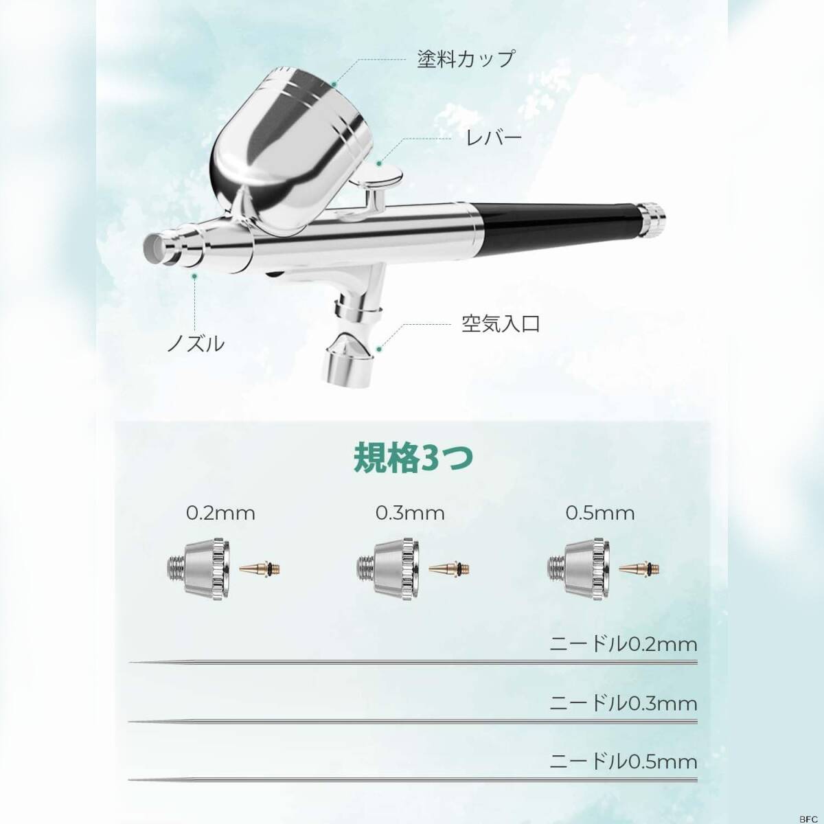 ■三種類の口径が付いた(0.2、0.3、0.5mm)エアブラシです。軽量で長時間の作業でも疲れにくい設計です。細やかなパーツから大きいパーツの塗装に。均一な塗装面から細かな塗り分けまで、キャンディ塗装からグラデーションまで幅広く使えます。
