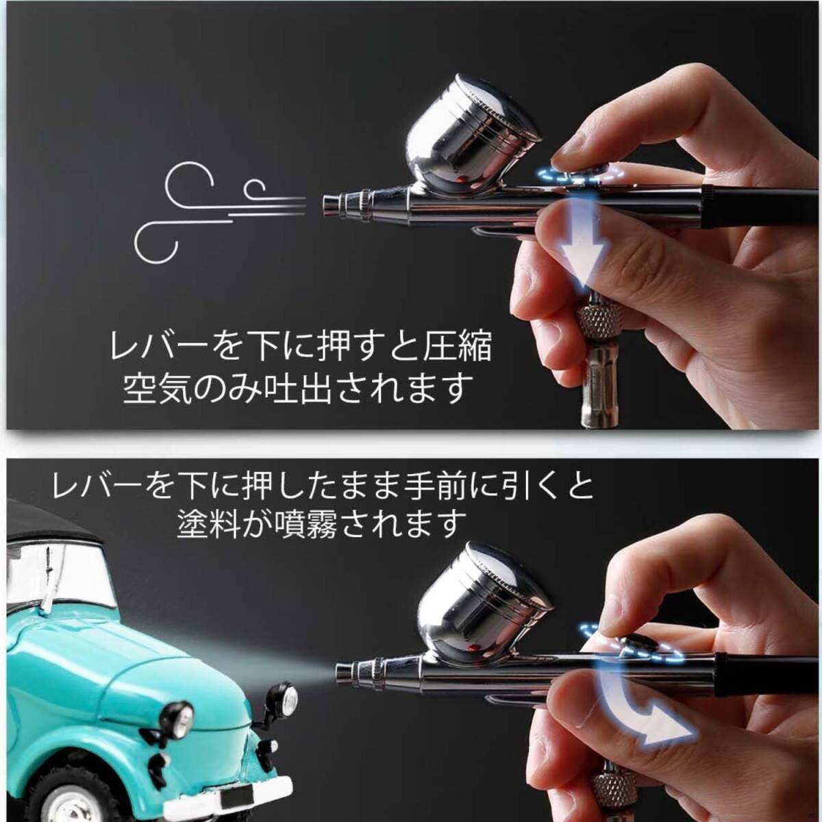 ■ダブルアクション式エアブラシは塗料の噴き出し量や線の幅を自由にコントロールできます。