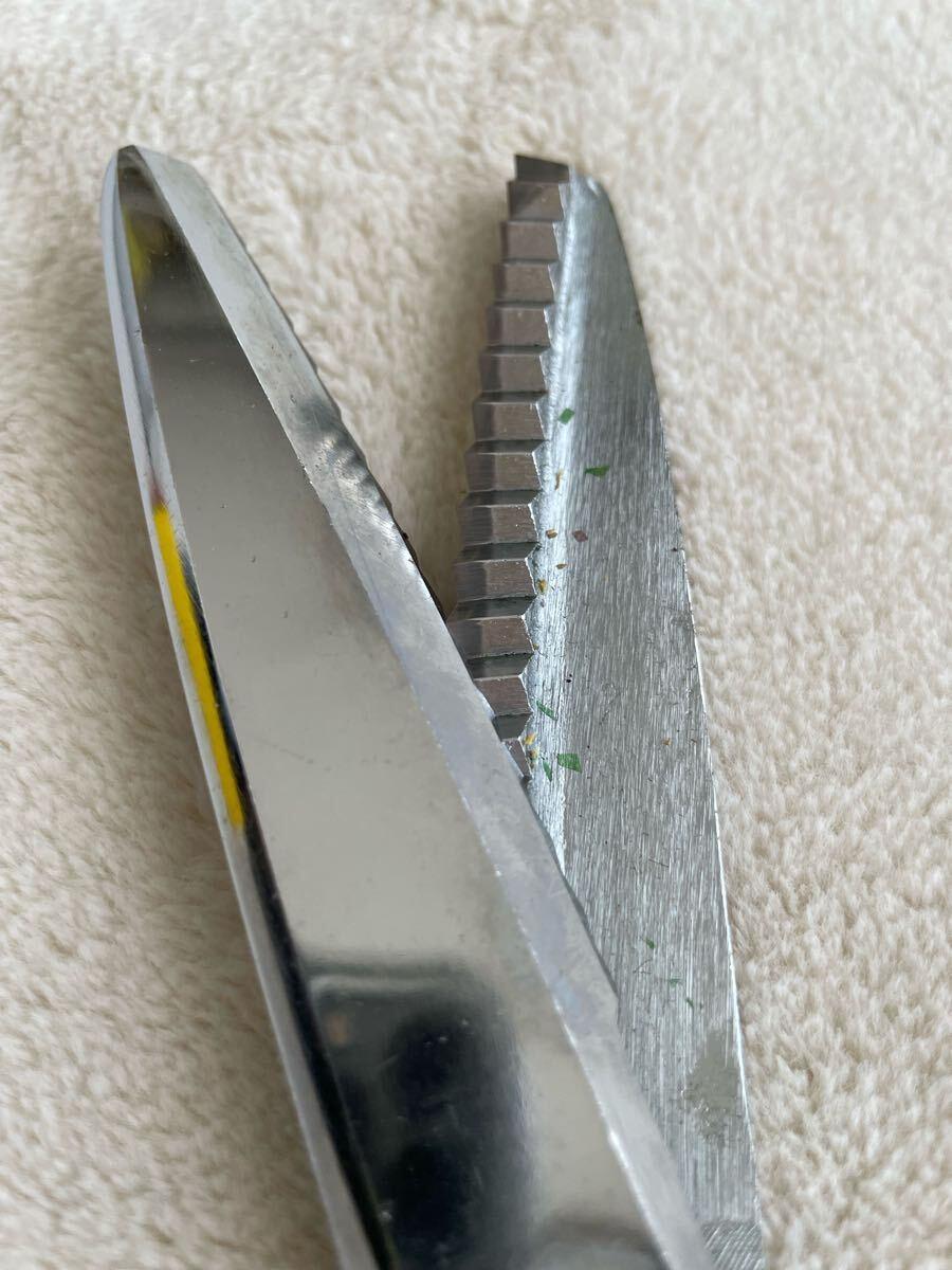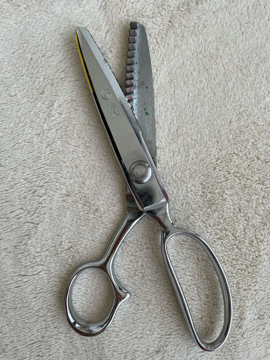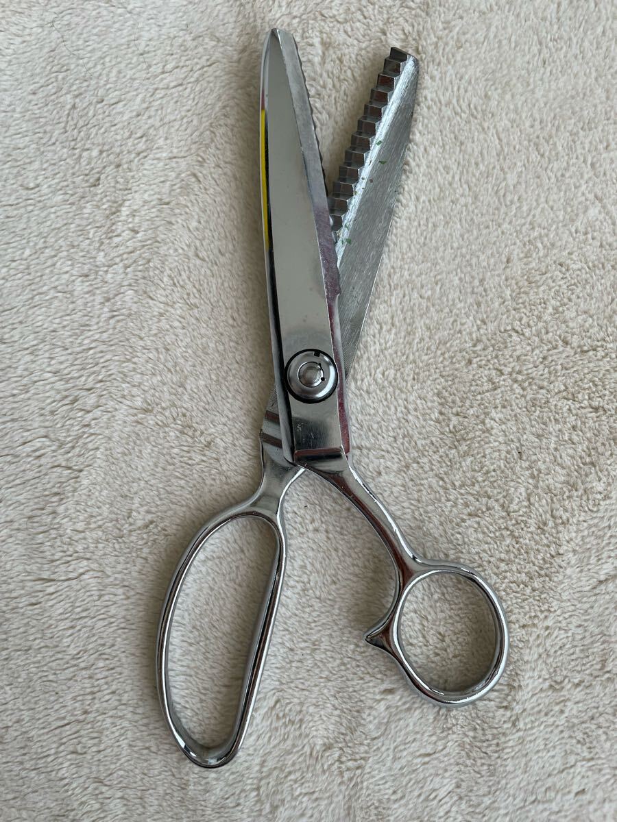 クラシックなデザインの裁ちばさみで、ギザギザの刃が特徴的なピンキングシアーズです。