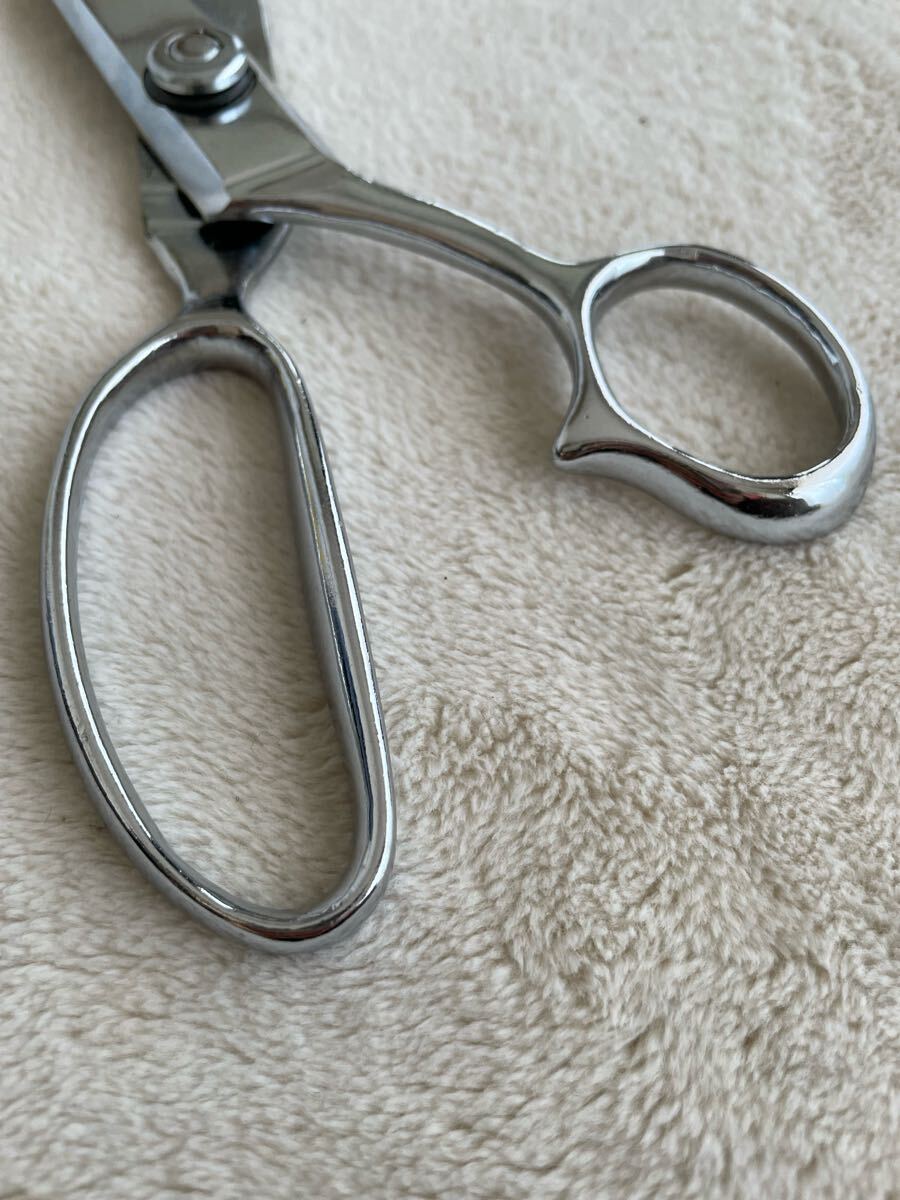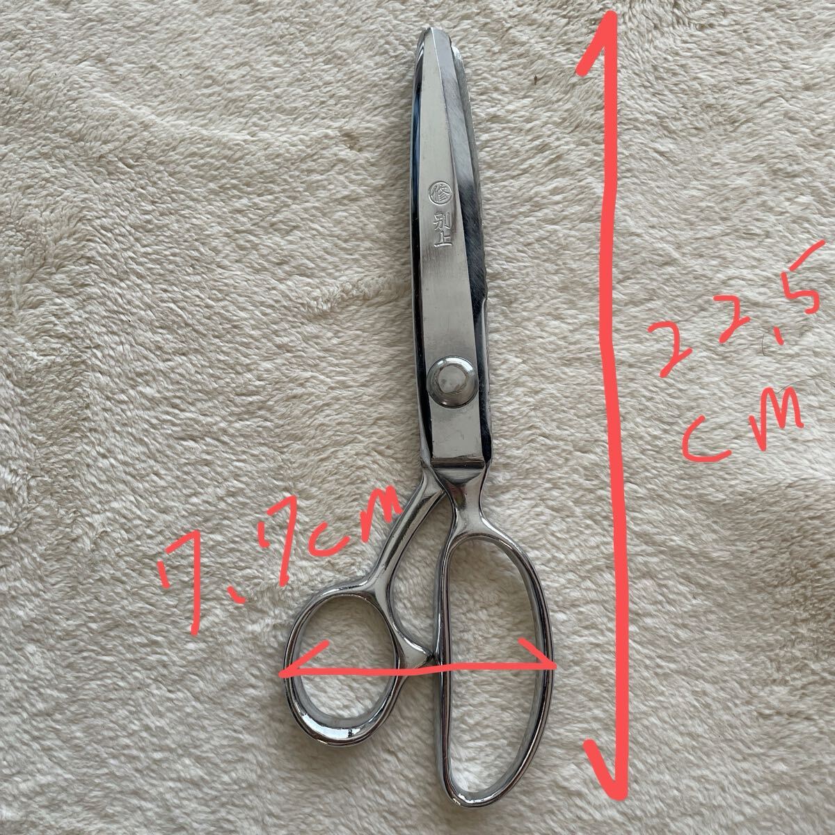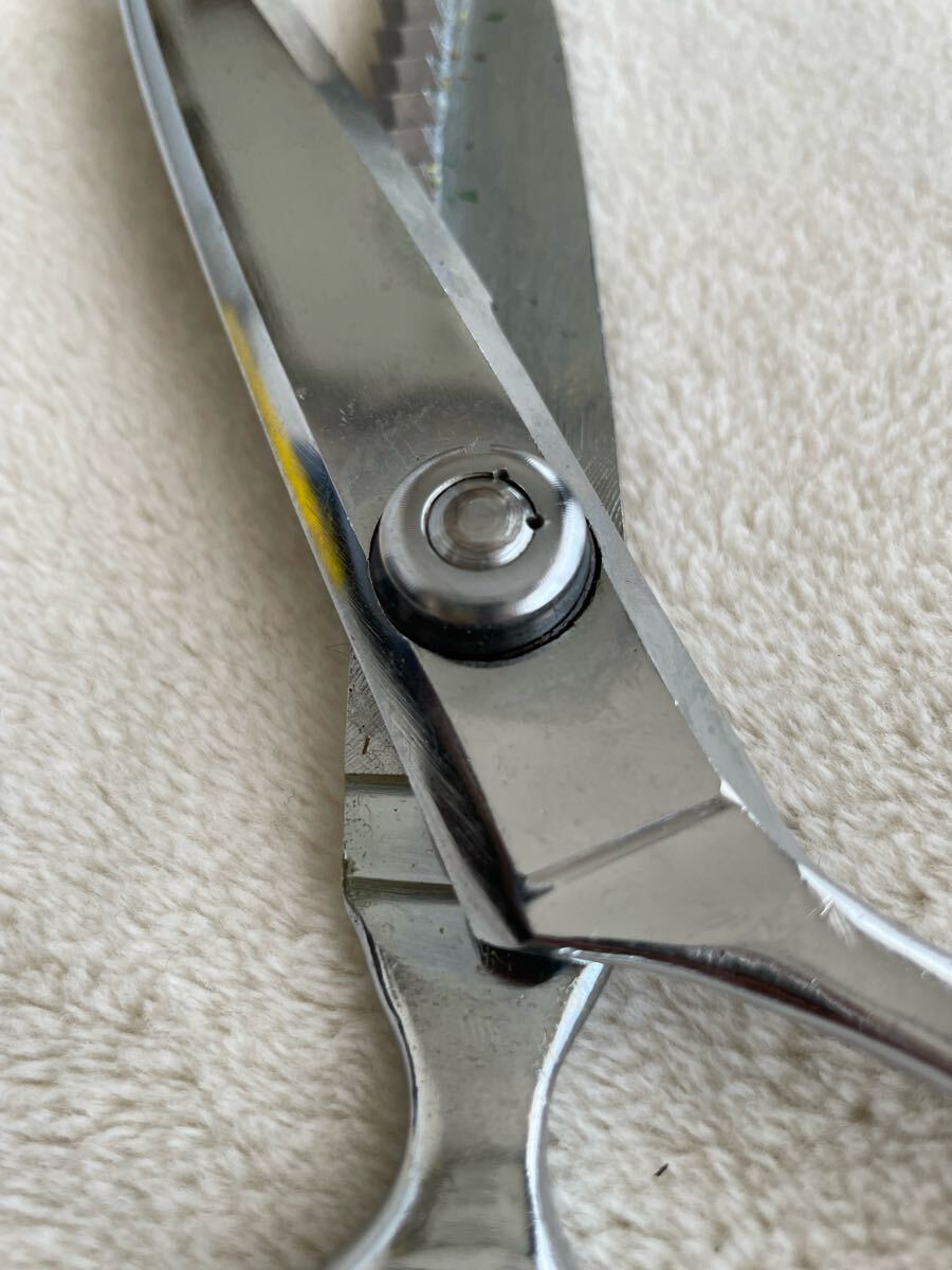 クラシックなデザインの裁ちばさみで、ギザギザの刃が特徴的なピンキングシアーズです。