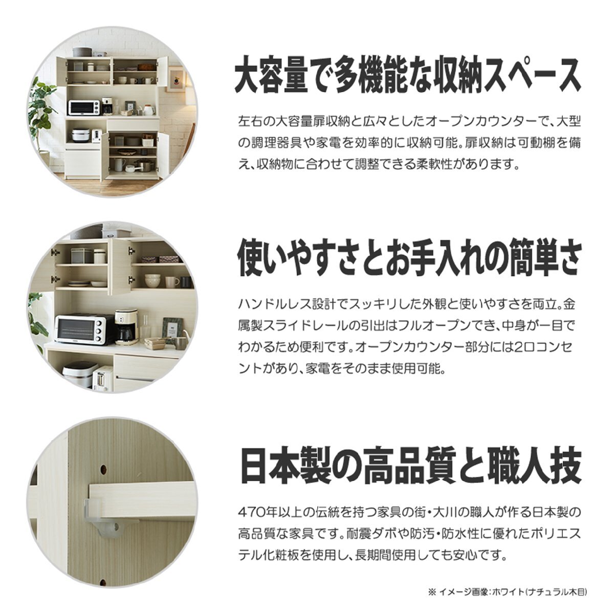 特  徴モイス付き食器棚。上台は開き扉収納、オープン収納。下台はフルスライドレール仕様のスライドカウンターと引き出し収納を備えた 日本製キッチンボード。