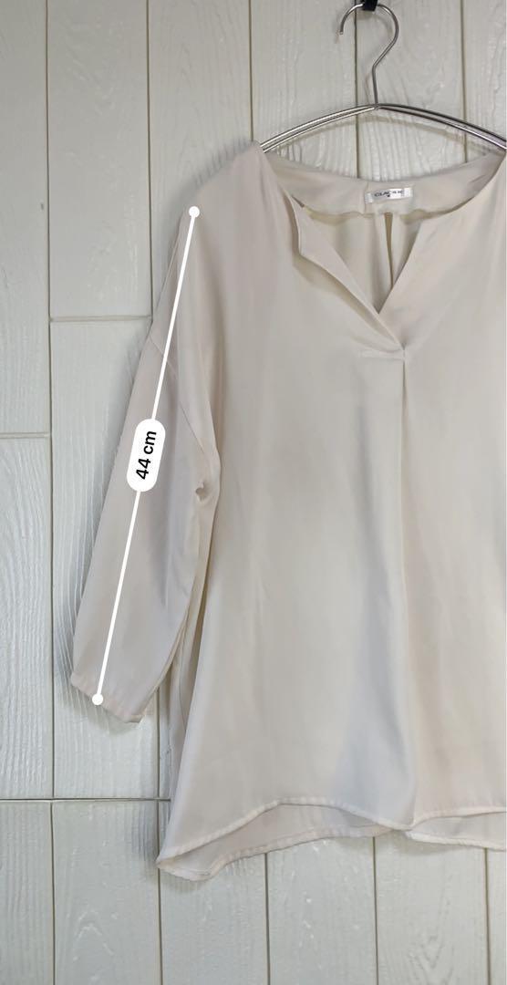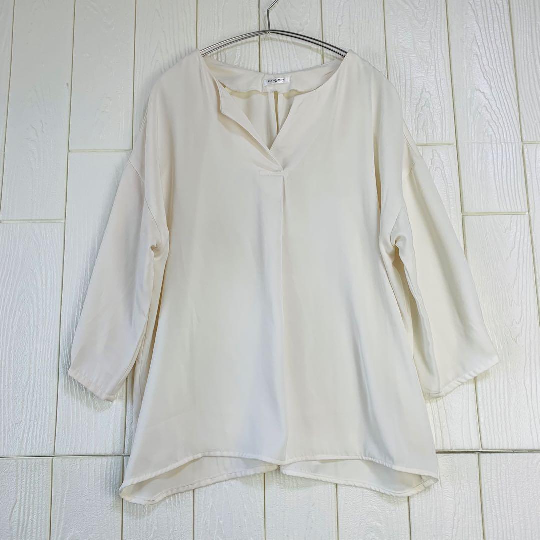 クリーム色の五分袖ブラウス、ゆったりとしたシルエットで快適な着心地。