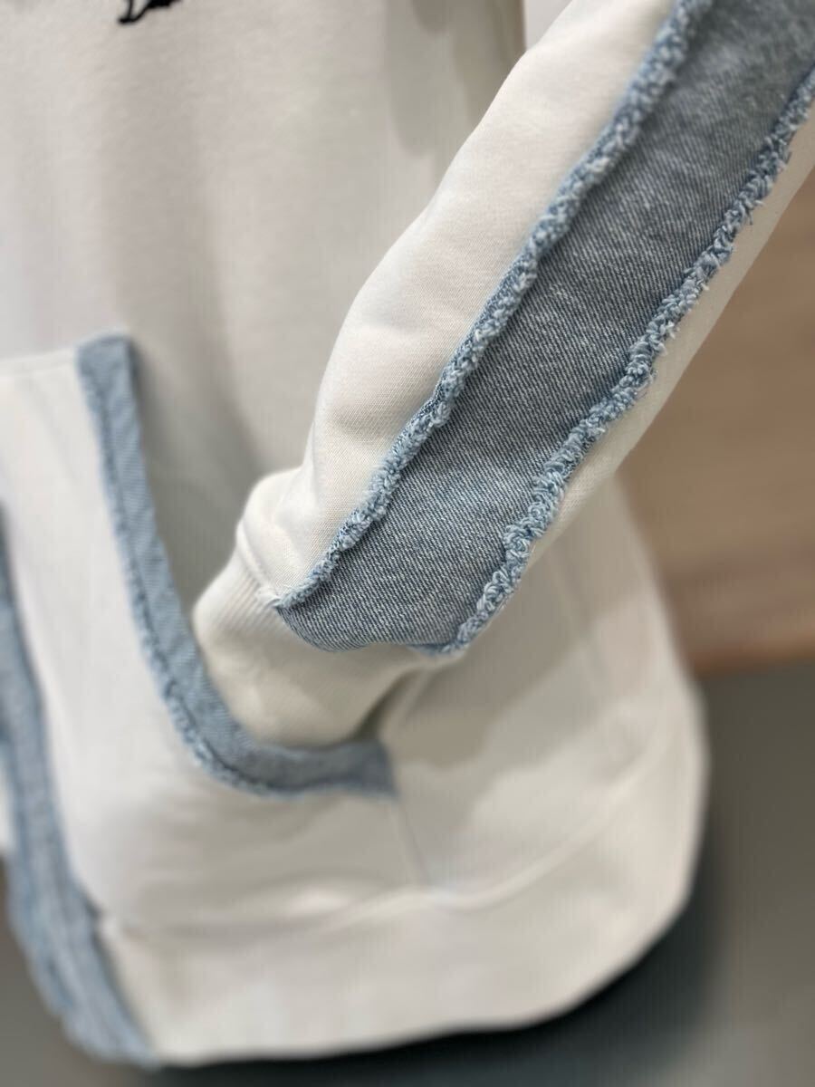 フ-ド部分、フロント回りのデニム使いが、リメイク感漂う仕上がりになっていて