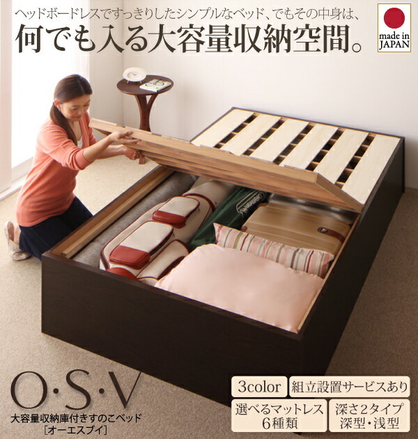 お客様組立 大容量収納庫付きすのこベッド HBレス O・S・V オーエスブイ マルチラススーパースプリングマットレス付き セミダブル 深さラージ【フレームカラー:ナチュラル】です。