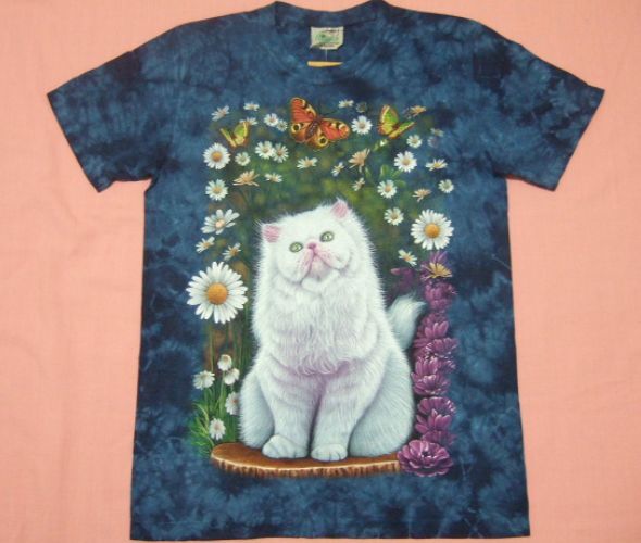 | 商品名 | 横浜最新 可愛い白猫ちゃんと花と蝶♪魅惑のTシャツ青 絞り柄 サイズ M |
