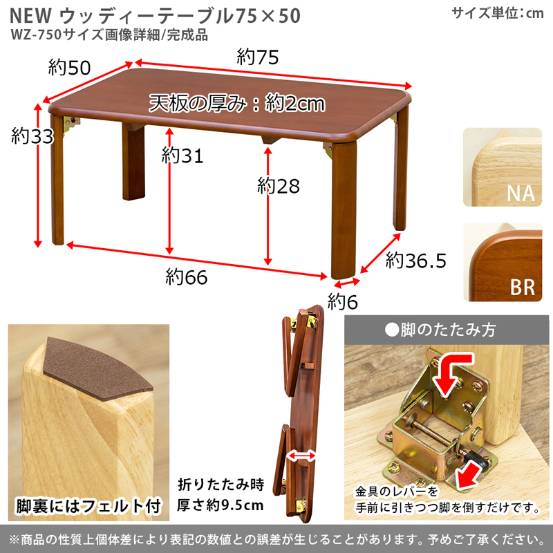 商品説明 | 【アウトレット】NEWウッディーテーブル 75 ナチュラル(NA) 落札後、最初の連絡で配達伝票に記載する電話番号をお尋ねします ■アウトレット品です 若干の擦り傷・塗装ムラがある場合が御座いますが、使用上差し支えの無い程度は御容赦下さい 天然木の折りたたみテーブル 75cm×50cmです 丈夫で使いやすさが魅力です ローテーブル・センターテーブル・ちゃぶ台と色々使え、折りたためば隙間にも収納できる天然木のテーブル 丈夫で耐久性のいいラバーウッドを使用し、角を丸く仕上げる事で、安心と温かみを出しました 天板裏には反り止め、脚の裏には傷防止のフェルト、合わせやすい定番カラー、優しい木目、折りたためば厚さ約9.5cmのコンパクト性等々…魅力がいっぱいです 普段使いから来客時の臨時テーブルなど、使い道はたくさんあります 便利なマルチテーブルです サイズ・容量 幅750×奥行500×高さ330mm(梱包サイズ:幅800×奥行525×高さ110mm) 天板の厚み:20mm 折りたたみ時厚さ:95mm 本体重量:6.6kg(梱包重量:9.1kg) 完成品(1個口) 規格 天然木(ラバーウッド)・ラッカー塗装 原産国:ベトナム ナチュラル(NA)専用ページです、ブラウン(BR)も有りますが別ベージとなってます。 ◆ナチュラルは特に木の節目や継ぎ目が目立ちます 節目が無い物はありませんのでご了承下さい |